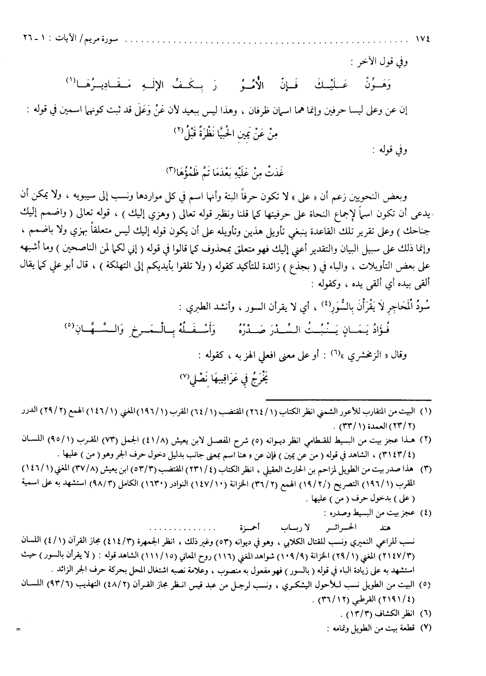 وبعض النحويين زعم أن على لا تكون حرفاً البتة ، وأنها اسم في كل مواردها ونسب إلى سيبويه ، ولا يمكن أن يدعي أن إلى تكون اسماً لإجماع النحاة على حرفى تها كما قلنا . ونظير قوله تعالى ) أَنزَلْنَا إِلَيْكَ ( قوله تعالى ) وَاضْمُمْ إِلَيْكَ جَنَاحَكَ ( وعلى تقرير تلك القاعدة ينبغي تأويل هذين ، وتأويله على أن يكون قوله ) إِلَيْكَ ( ليس متعلقاً بهزي ولا باضم ، وإنما ذلك على سبيل البيان والتقدير أعني إليك فهو متعلق بمحذوف كما قالوا في قوله ) إِنّي لَكُمَا لَمِنَ النَّاصِحِينَ ( وما أشبهه على بعض التأويلات . والباء في ) بِجِذْعِ ( زائدة للتأكيد كقوله ) وَلاَ تُلْقُواْ بِأَيْدِيكُمْ إِلَى التَّهْلُكَةِ ). قال أبو عليّ كما يقال : ألقى بيده أي ألقى يده . وكقوله :