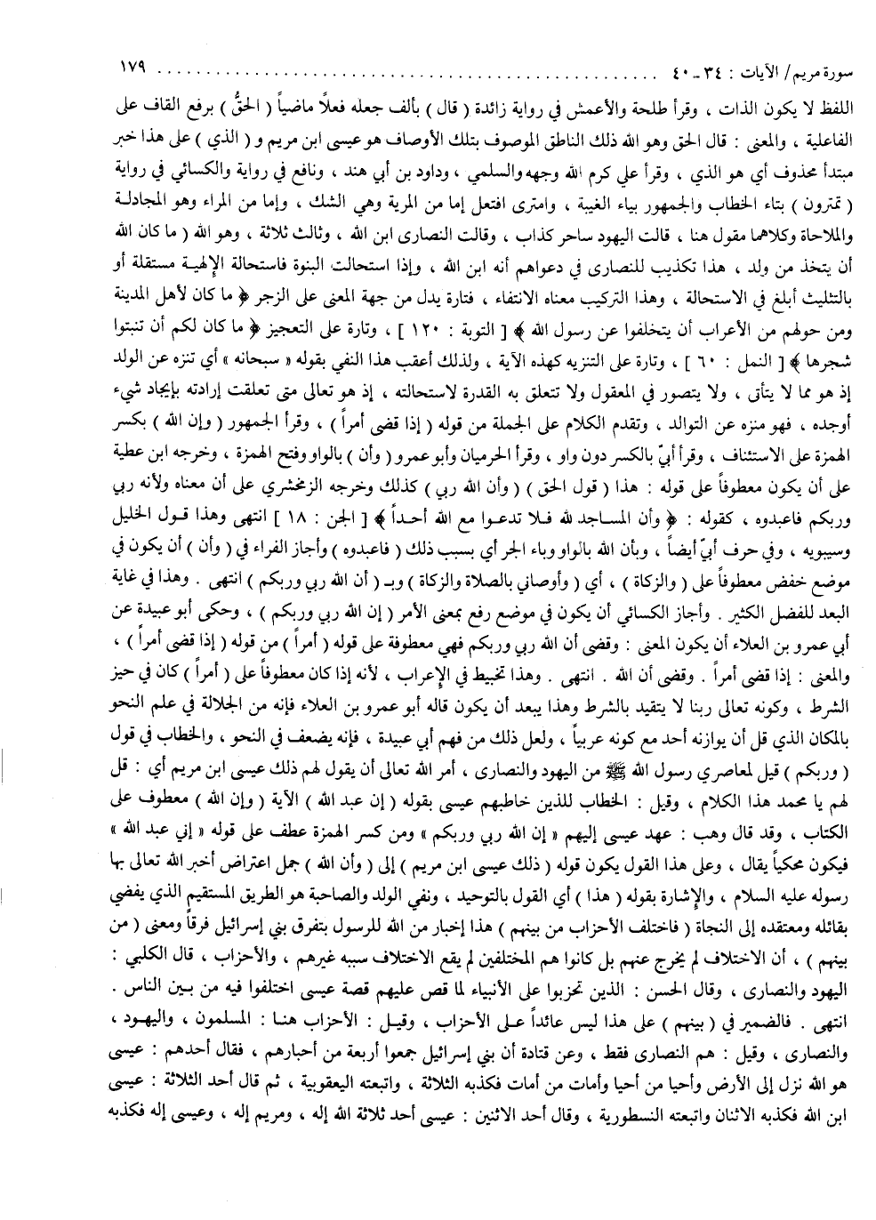 اللفظ لا يكون الذات . وقرأ طلحة والأعمش في رواية زائدة قال : بألف جعله فعلاً ماضياً ) الْحَقّ ( برفع القاف على الفاعلية ، والمعنى قال الحق وهو الله ) ذالِكَ ( الناطق الموصوف بتلك الأوصاف هو ) عِيسَى ابْنَ مَرْيَمَ ( و ) الَّذِى ( على هذا خبر مبتدأ محذوف أي هو الذي . وقرأ عليّ كرم الله وجهه والسلمي وداود بن أبي هند ونافع في رواية والكسائي في رواية ) تَمْتَرُونَ ( بتاء الخطاب والجمهور بياء الغيبة ، وامترى افتعل إما من المرية وهي الشك ، وإما من المراء وهو المجادلة والملاحاة ، وكلاهما مقول هنا قالت اليهود ساحر كذاب ، وقالت النصارى ابن الله وثالثها ثلاثة وهو الله