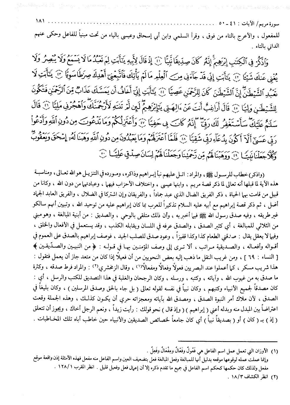 وقال الزمخشري : والمراد فرط صدقه وكثرة ما صدق به من غيوب الله وآياته وكتبه ورسله ، وكان الرجحان والغلبة في هذا التصديق للكتب والرسل أي كان مصدقاً لجميع الأنبياء وكتبهم وكان ) نَبِيّاً ( في نفسه لقوله تعالى ) بَلْ جَاء بِالْحَقّ وَصَدَّقَ الْمُرْسَلِينَ ( وكان بليغ في الصدق لأن ملاك أمر النبوة الصدق ومصدق الله بآياته ومعجزاته حري أن يكون كذلك ، وهذه الجملة وقعت اعتراضاً بين المبدل منه وبدله أعني ) إِبْرَاهِيمَ ).