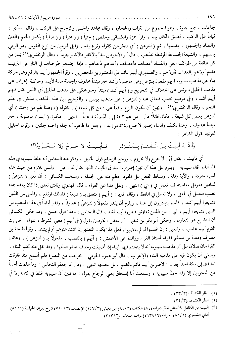 أي فأبيت يقال فيّ لا حرج ولا محروم ، ورجح الزجاج قول الخليل وذكر عنه النحاس أنه غلط سيبويه في هذه المسألة . قال سيبويه : ويلزم على هذا أن يجوز اضرب السارق الخبيث الذي يقال له قبل ، وليس بلازم من حيث هذه أسماء مفردة والآية جملة وتسلط الفعل على المفرد أعظم منه على الجملة . ومذهب الكسائي أن معنى ) لَنَنزِعَنَّ ( لنناذين فعومل معاملته فلم تعمل في أي انتهى . ونقل هذا عن الفراء . قال المهدوي : ونادى تعلق إذا كان بعده جملة نصب فتعمل في المعنى ولا تعمل في اللفظ . وقال المبرد : ) أَيُّهُم ( متعلق بشيعة ، فلذلك ارتفع والمعنى من الذين تشايعوا ) أَيُّهُمْ أَشَدُّ ( كأنهم يتبادرون إلى هذا ، ويلزم أن يقدر مفعولاً ) لَنَنزِعَنَّ ( محذوفاً وقدر أيضاً في هذا المذهب من الذين تشايعوا ) أَيُّهُم ( أي من الذين تعاونوا فنظروا ) أَيُّهُمْ أَشَدُّ ). قال النحاس : وهذا قول حسن . وقد حكى الكسائي أن التشايع هو التعاون .