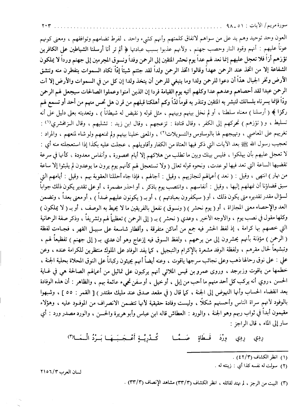 ( أَلَمْ تَرَ أَنَّا أَرْسَلْنَا الشَّيَاطِينَ عَلَى الْكَافِرِينَ تَؤُزُّهُمْ أَزّاً فَلاَ تَعْجَلْ عَلَيْهِمْ إِنَّمَا نَعُدُّ لَهُمْ عَدّاً يَوْمَ نَحْشُرُ الْمُتَّقِينَ إِلَى الرَّحْمَنِ وَفْداً وَنَسُوقُ الْمُجْرِمِينَ إِلَى جَهَنَّمَ وِرْداً لاَّ يَمْلِكُونَ الشَّفَاعَةَ إِلاَّ مَنِ اتَّخَذَ عِندَ الرَّحْمَنِ عَهْداً وَقَالُواْ اتَّخَذَ الرَّحْمَنُ وَلَداً لَقَدْ جِئْتُمْ شَيْئاً إِذَا تَكَادُ السَّمَاوَاتِ يَتَفَطَّرْنَ مِنْهُ وَتَنشَقُّ الاْرْضُ وَتَخِرُّ الْجِبَالُ هَاذَا إِنْ دَعَوْا لِلرَّحْمَانِ وَلَداً وَمَا يَنبَغِى لِلرَّحْمَانِ أَن يَتَّخِذَ وَلَداً إِن كُلُّ مَن فِى السَّمَاوَاتِ وَالاْرْضَ إِلاَّ اتِّبَاعَ الرَّحْمَنِ عَبْداً لَّقَدْ أَحْصَاهُمْ وَعَدَّهُمْ عَدّاً وَكُلُّهُمْ ءاتِيهِ يَوْمَ الْقِيَامَةِ فَرْداً إِنَّ الَّذِينَ ءامَنُواْ وَعَمِلُواْ الصَّالِحَاتِ سَيَجْعَلُ لَهُمُ الرَّحْمَنُ وُدّاً فَإِنَّمَا يَسَّرْنَاهُ بِلَسَانِكَ لِتُبَشّرَ بِهِ الْمُتَّقِينَ وَتُنْذِرَ بِهِ قَوْماً لُّدّاً وَكَمْ أَهْلَكْنَا قَبْلَهُمْ مّن قَرْنٍ هَلْ تُحِسُّ مِنْهُمْ مّنْ أَحَدٍ أَوْ تَسْمَعُ لَهُمْ رِكْزاً ).
