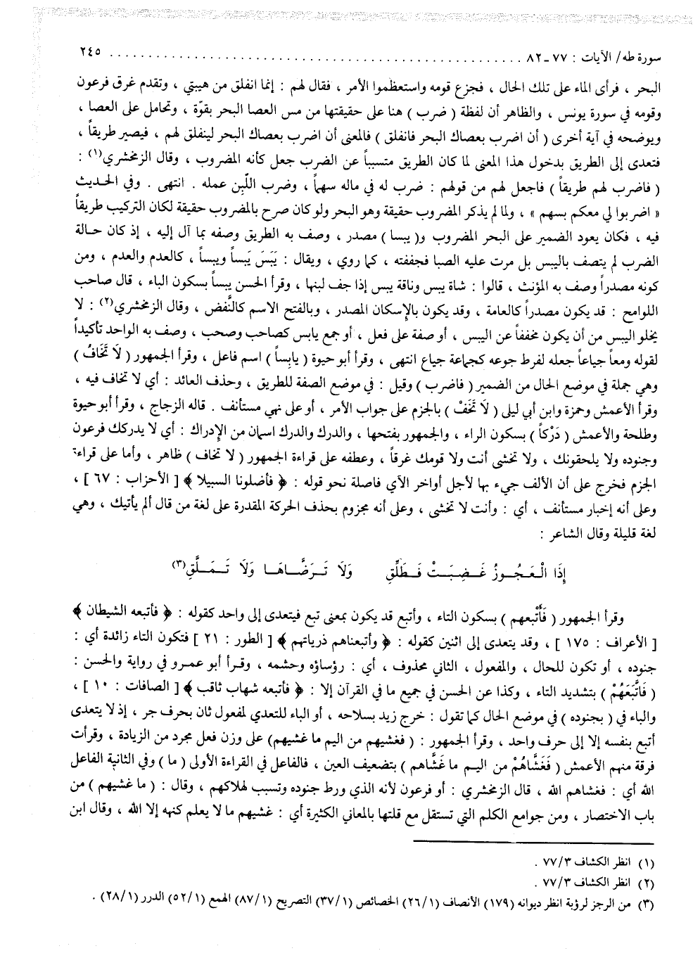 وقرأ الجمهور : لا تخاف وهي جملة في موضع الحال من الضمير ) فَاضْرِب ( وقيل في موضع الصفة للطريق ، وحذف العائد أي لا تخاف فيه . وقرأ الأعمش : وحمزة وابن أبي ليلى ) لاَ تَخَفْ ( بالجزم على جواب الأمر أو على نهي مستأنف قاله الزجاج . وقرأ أبو حيوة وطلحة والأعمش ، دَرْكاً بسكون الراء والجمهور بفتحها ، والدرك والدرك اسمان من الإدراك أي لا يدركك فرعون وجنوده ولا يلحقونك ) وَلاَ تَخْشَى ( أنت ولا قومك غرقاً وعطفه على قراءة الجمهور لا تخاف ظاهر ، وأما على قراءة الجزم فخرج على أن الألف جيء بها لأجل أواخر الآي فاصلة نحو قوله ) فَأَضَلُّونَا السَّبِيلاْ ( وعلى أنه إخبار مستأنف أي وأنت ) لا ( وعلى أنه مجزوم بحذف الحركة المقدرة على لغة من قال : ألم يأتيك وهي لغة قليلة . وقال الشاعر : إذا العجوز غضبت فطلق