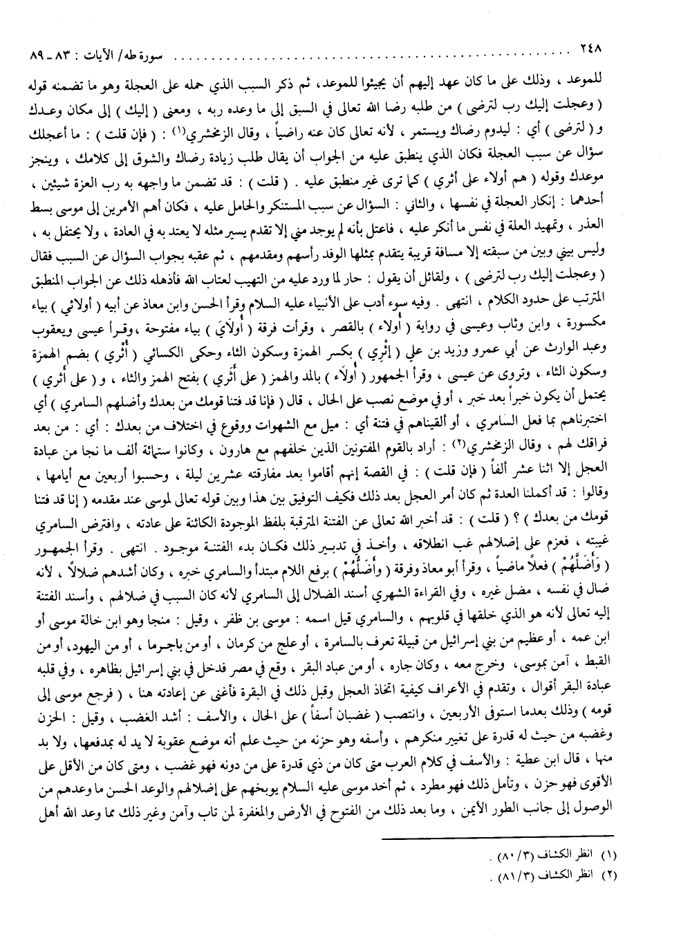 وقرأ الجمهور : ) وَأَضَلَّهُمُ ( فعلاً ماضياً . وقرأ أبو معاذ وفرقة وأضَلُهم برفع اللام مبتدأ والسامري خبره وكان أشدهم ضلالاً لأنه ضال في نفسه مضل غيره . وفي القراءة الشهري أسند الضلال إلى السامري لأنه كان السبب في ضلالهم ، وأسند الفتنة إليه تعالى لأنه هو الذي خلقها في قلوبهم . و ) السَّامِرِىُّ ( قيل اسمه موسى بن ظفر . وقيل : منجا وهو ابن خالة موسى أو ابن عمه أو عظيم من بني إسرائيل من قبيلة تعرف بالسامرة ، أو علج من كرمان ، أو من باجرما أو من اليهود أو من القبط آمن بموسى وخرج معه ، وكان جاره أو من عباد البقر وقع في مصر فدخل في بني اسرائيل بظاهره وفي قلبه عبادة البقر أقوال وتقوم في الأعراف كيفية اتخاذ العجل وقبل ذلك في البقرة فأغنى عن إعادتها هنا .