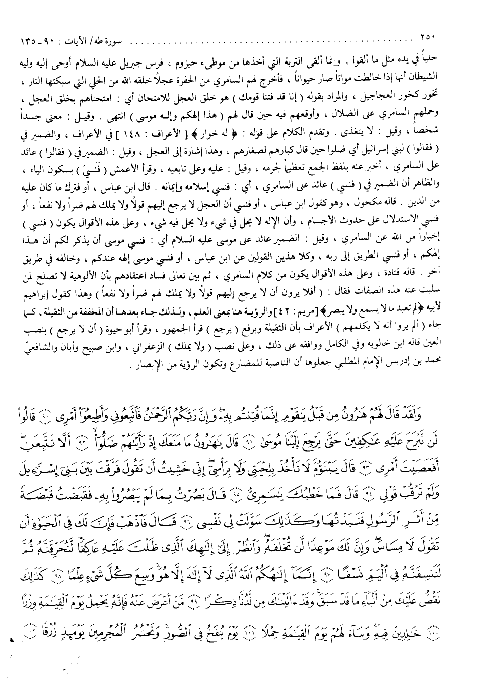 2 ( ) قَالُواْ لَن نَّبْرَحَ عَلَيْهِ عَاكِفِينَ حَتَّى يَرْجِعَ إِلَيْنَا مُوسَى قَالَ ياهَارُونُ مَا مَنَعَكَ إِذْ رَأَيْتَهُمْ ضَلُّواْ أَلاَّ تَتَّبِعَنِ أَفَعَصَيْتَ أَمْرِى قَالَ يَبْنَؤُمَّ لاَ تَأْخُذْ بِلِحْيَتِى وَلاَ بِرَأْسِى إِنِّى خَشِيتُ أَن تَقُولَ فَرَّقْتَ بَيْنَ بَنِىإِسْرءِيلَ وَلَمْ تَرْقُبْ قَوْلِى قَالَ فَمَا خَطْبُكَ ياسَامِرِيُّ قَالَ بَصُرْتُ بِمَا لَمْ يَبْصُرُواْ بِهِ فَقَبَضْتُ قَبْضَةً مِّنْ أَثَرِ الرَّسُولِ فَنَبَذْتُهَا وَكَذالِكَ سَوَّلَتْ لِى نَفْسِى قَالَ فَاذْهَبْ فَإِنَّ لَكَ فِى الْحَيَواةِ أَن تَقُولَ لاَ مِسَاسَ وَإِنَّ لَكَ مَوْعِداً لَّن تُخْلَفَهُ وَانظُرْ إِلَى إِلَاهِكَ الَّذِى ظَلْتَ عَلَيْهِ عَاكِفاً لَّنُحَرِّقَنَّهُ ثُمَّ لَنَنسِفَنَّهُ فِى الْيَمِّ نَسْفاً إِنَّمَآ إِلَاهُكُمُ اللَّهُ الَّذِى لاإِلَاهَ إِلاَّ هُوَ وَسِعَ كُلَّ شَىْءٍ عِلْماً كَذالِكَ نَقُصُّ عَلَيْكَ مِنْ أَنْبَآءِ مَا قَدْ سَبَقَ وَقَدْ آتَيْنَاكَ مِن لَّدُنَّا ذِكْراً مَّنْ أَعْرَضَ عَنْهُ فَإِنَّهُ يَحْمِلُ يَوْمَ الْقِيَامَةِ وِزْراً خَالِدِينَ فِيهِ وَسَآءَ لَهُمْ يَوْمَ الْقِيَامَةِ حِمْلاً يَوْمَ يُنفَخُ فِى الصُّورِ وَنَحْشُرُ الْمُجْرِمِينَ يَوْمِئِذٍ زُرْقاً