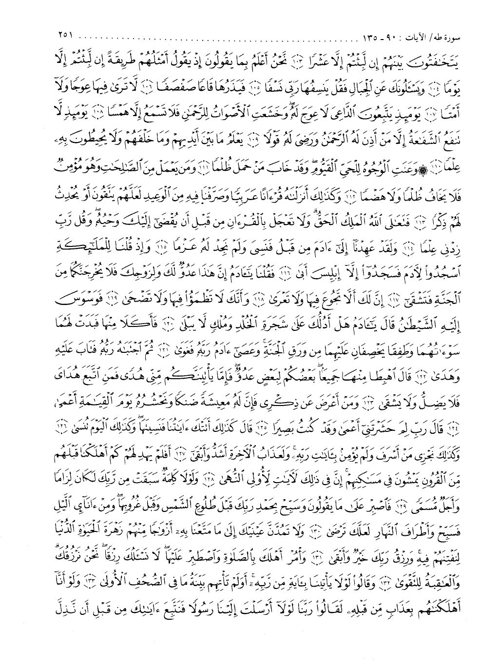 يَتَخَافَتُونَ بَيْنَهُمْ إِن لَّبِثْتُمْ إِلاَّ عَشْراً نَّحْنُ أَعْلَمُ بِمَا يَقُولُونَ إِذْ يَقُولُ أَمْثَلُهُمْ طَرِيقَةً إِن لَّبِثْتُمْ إِلاَّ يَوْماً وَيَسْألُونَكَ عَنِ الْجِبَالِ فَقُلْ يَنسِفُهَا رَبِّى نَسْفاً فَيَذَرُهَا قَاعاً صَفْصَفاً لاَّ تَرَى فِيهَا عِوَجاً وَلاأَمْتاً يَوْمَئِذٍ يَتَّبِعُونَ الدَّاعِىَ لاَ عِوَجَ لَهُ وَخَشَعَتِ الأَصْوَاتُ لِلرَّحْمَانِ فَلاَ تَسْمَعُ إِلاَّ هَمْساً يَوْمَئِذٍ لاَّ تَنفَعُ الشَّفَاعَةُ إِلاَّ مَنْ أَذِنَ لَهُ الرَّحْمَنُ وَرَضِىَ لَهُ قَوْلاً يَعْلَمُ مَا بَيْنَ أَيْدِيهِمْ وَمَا خَلْفَهُمْ وَلاَ يُحِيطُونَ بِهِ عِلْماً وَعَنَتِ الْوُجُوهُ لِلْحَىِّ الْقَيُّومِ وَقَدْ خَابَ مَنْ حَمَلَ ظُلْماً وَمَن يَعْمَلْ مِنَ الصَّالِحَاتِ وَهُوَ مُؤْمِنٌ فَلاَ يَخَافُ ظُلْماً وَلاَ هَضْماً وَكَذالِكَ أَنزَلْنَاهُ قُرْءَاناً عَرَبِيّاً وَصَرَّفْنَا فِيهِ مِنَ الْوَعِيدِ لَعَلَّهُمْ يَتَّقُونَ أَوْ يُحْدِثُ لَهُمْ ذِكْراً فَتَعَالَى اللَّهُ الْمَلِكُ الْحَقُّ وَلاَ تَعْجَلْ بِالْقُرْءانِ مِن قَبْلِ إَن يُقْضَى إِلَيْكَ وَحْيُهُ وَقُل رَّبِّ زِدْنِى عِلْماً وَلَقَدْ عَهِدْنَآ إِلَىءَادَمَ مِن قَبْلُ فَنَسِىَ وَلَمْ نَجِدْ لَهُ عَزْماً وَإِذْ قُلْنَا لِلْمَلَائِكَةِ اسْجُدُواْ لأَدَمَ فَسَجَدُواْ إِلاَّ إِبْلِيسَ أَبَى فَقُلْنَا ياأادَمُ إِنَّ هَاذَا عَدُوٌّ لَّكَ وَلِزَوْجِكَ فَلاَ يُخْرِجَنَّكُمَا مِنَ الْجَنَّةِ فَتَشْقَى إِنَّ لَكَ أَلاَّ تَجُوعَ فِيهَا وَلاَ تَعْرَى وَأَنَّكَ لاَ تَظْمَؤُا فِيهَا وَلاَ تَضْحَى فَوَسْوَسَ إِلَيْهِ الشَّيْطَانُ قَالَ ياأادَمُ هَلْ أَدُلُّكَ عَلَى شَجَرَةِ الْخُلْدِ وَمُلْكٍ لاَّ يَبْلَى فَأَكَلاَ مِنْهَا فَبَدَتْ لَهُمَا سَوْءَاتُهُمَا وَطَفِقَا يَخْصِفَانِ عَلَيْهِمَا مِن وَرَقِ الْجَنَّةِ وَعَصَىءَادَمُ رَبَّهُ فَغَوَى ثُمَّ اجْتَبَاهُ رَبُّهُ فَتَابَ عَلَيْهِ وَهَدَى قَالَ اهْبِطَا مِنْهَا جَمِيعاً بَعْضُكُمْ لِبَعْضٍ عَدُوٌّ فَإِمَّا يَأْتِيَنَّكُم مِّنِّى هُدًى فَمَنِ اتَّبَعَ هُدَاىَ فَلاَ يَضِلُّ وَلاَ يَشْقَى وَمَنْ أَعْرَضَ عَن ذِكْرِى فَإِنَّ لَهُ مَعِيشَةً ضَنكاً وَنَحْشُرُهُ يَوْمَ الْقِيامَةِ أَعْمَى قَالَ رَبِّ لِمَ حَشَرْتَنِىأَعْمَى وَقَدْ كُنتُ بَصِيراً قَالَ كَذالِكَ أَتَتْكَ آيَاتُنَا فَنَسِيتَهَا وَكَذالِكَ الْيَوْمَ تُنْسَى وَكَذالِكَ نَجْزِى مَنْ أَسْرَفَ وَلَمْ يُؤْمِن بِأايَاتِ رَبِّهِ وَلَعَذَابُ الاٌّ خِرَةِ أَشَدُّ وَأَبْقَى أَفَلَمْ يَهْدِ لَهُمْ كَمْ أَهْلَكْنَا قَبْلَهُمْ مِّنَ الْقُرُونِ يَمْشُونَ فِى مَسَاكِنِهِمْ إِنَّ فِى ذَلِكَ لأَيَاتٍ لاٌّ وْلِى النُّهَى وَلَوْلاَ كَلِمَةٌ سَبَقَتْ مِن رَّبِّكَ لَكَانَ لِزَاماً وَأَجَلٌ مُّسَمًّى فَاصْبِرْ عَلَى مَا يَقُولُونَ وَسَبِّحْ بِحَمْدِ رَبِّكَ قَبْلَ طُلُوعِ الشَّمْسِ وَقَبْلَ غُرُوبِهَا وَمِنْ ءَانَآءِ الَّيْلِ فَسَبِّحْ وَأَطْرَافَ النَّهَارِ لَعَلَّكَ تَرْضَى وَلاَ تَمُدَّنَّ عَيْنَيْكَ إِلَى مَا مَتَّعْنَا بِهِ أَزْوَاجاً مِّنْهُمْ زَهْرَةَ الْحَيَواةِ الدُّنْيَا لِنَفْتِنَهُمْ فِيهِ وَرِزْقُ رَبِّكَ خَيْرٌ وَأَبْقَى وَأْمُرْ أَهْلَكَ بِالصَّلواةِ وَاصْطَبِرْ عَلَيْهَا لاَ نَسْأَلُكَ رِزْقاً نَّحْنُ نَرْزُقُكَ وَالْعَاقِبَةُ لِلتَّقْوَى وَقَالُواْ لَوْلاَ يَأْتِينَا بِأايَةٍ مِّن رَّبِّهِ أَوَلَمْ تَأْتِهِمْ بَيِّنَةُ مَا فِى الصُّحُفِ الاٍّ ولَى وَلَوْ أَنَّآ أَهْلَكْنَاهُمْ بِعَذَابٍ مِّن قَبْلِهِ لَقَالُواْ رَبَّنَا لَوْلاأَرْسَلْتَ إِلَيْنَا رَسُولاً فَنَتَّبِعَ ءَايَاتِكَ مِن قَبْلِ أَن نَّذِل