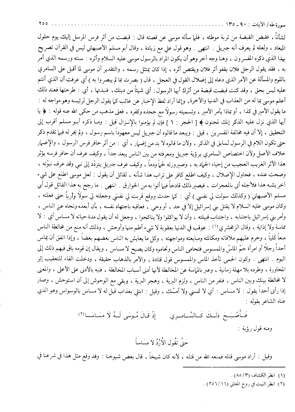 وقال أبو مسلم الأصبهاني : ليس في القرآن تصريح بهذا الذي ذكره المفسرون ، وهنا وجه آخر وهو أن يكون المراد بالرسول موسى عليه السلام ، وأثره سنته ورسمه الذي أمر به ، فقد يقول الرجل : فلان يقفو أثر فلان ويقتص أثره إذا كان يمتثل رسمه ، والتقدير أن موسى لما أقبل على السامري باللوم والمسألة عن الأمر الذي دعاه إلى إضلال القول في العجل ) قَالَ بَصُرْتُ بِمَا لَمْ يَبْصُرُواْ بِهِ ( أي عرفت أن الذي أنتم عليه ليس بحق ، وقد كنت قبضت قبضة من أثرك أيها الرسول أي شيئاً من دينك ) فَنَبَذْتُهَا ( أي طرحتها . فعند ذلك أعلم موسى بما له من العذاب في الدنيا والآخرة وإنما أراد لفظ الإخبار عن غائب كما يقول الرجل لرئيسه وهو مواجه له : ما يقول الأمير في كذا أو بماذا يأمر الأمير ، وتسميته رسولاً مع جحده وكفره ، فعلى مذهب من حكى الله عنه قوله ) وَقَالُواْ يأَيُّهَا الَّذِى نُزّلَ عَلَيْهِ الذّكْرُ إِنَّكَ لَمَجْنُونٌ ( فإن لم يئمنوا بالإنزال قيل : وما ذكره أبو مسلم أقرب إلى التحقيق إلاّ أن فيه مخالفة المفسرين . قيل : ويبعد ما قالوه أن جبريل ليس معهوداً باسم رسول ، ولم يجر له فيما تقدم ذكر حتى تكون اللام في الرسول لسابق في الذكر ، ولأن ما قالوه لا بد من إضمار أي من أثر حافر فرس الرسول والإضمار خلاف الأصل ، ولأن اختصاص السامري برؤية جبريل ومعرفته من بين الناس يبعد جداً ، وكيف عرف أن حافر فرسه يؤثر هذا الأثر الغريب العجيب من إحياء الجماد به وصيرورته لحماً ودماً ؟ وكيف عرف جبريل يتردّد إلى نبيّ وقد عرف نبوّته وصحت عنده فحاول الإضلال ؟ ويكف اطلع كافر على تراب هذا شأنه ؟ فلقائل أن يقول : لعل موسى اطلع على شيء آخر يشبه هذا فلأجله أتى بالمعجزات ، فيصير ذلك قادحاً فيما أتوا به من الخوارق انتهى . ما رجح به هذا القائل قول أبي مسلم الأصبهاني .