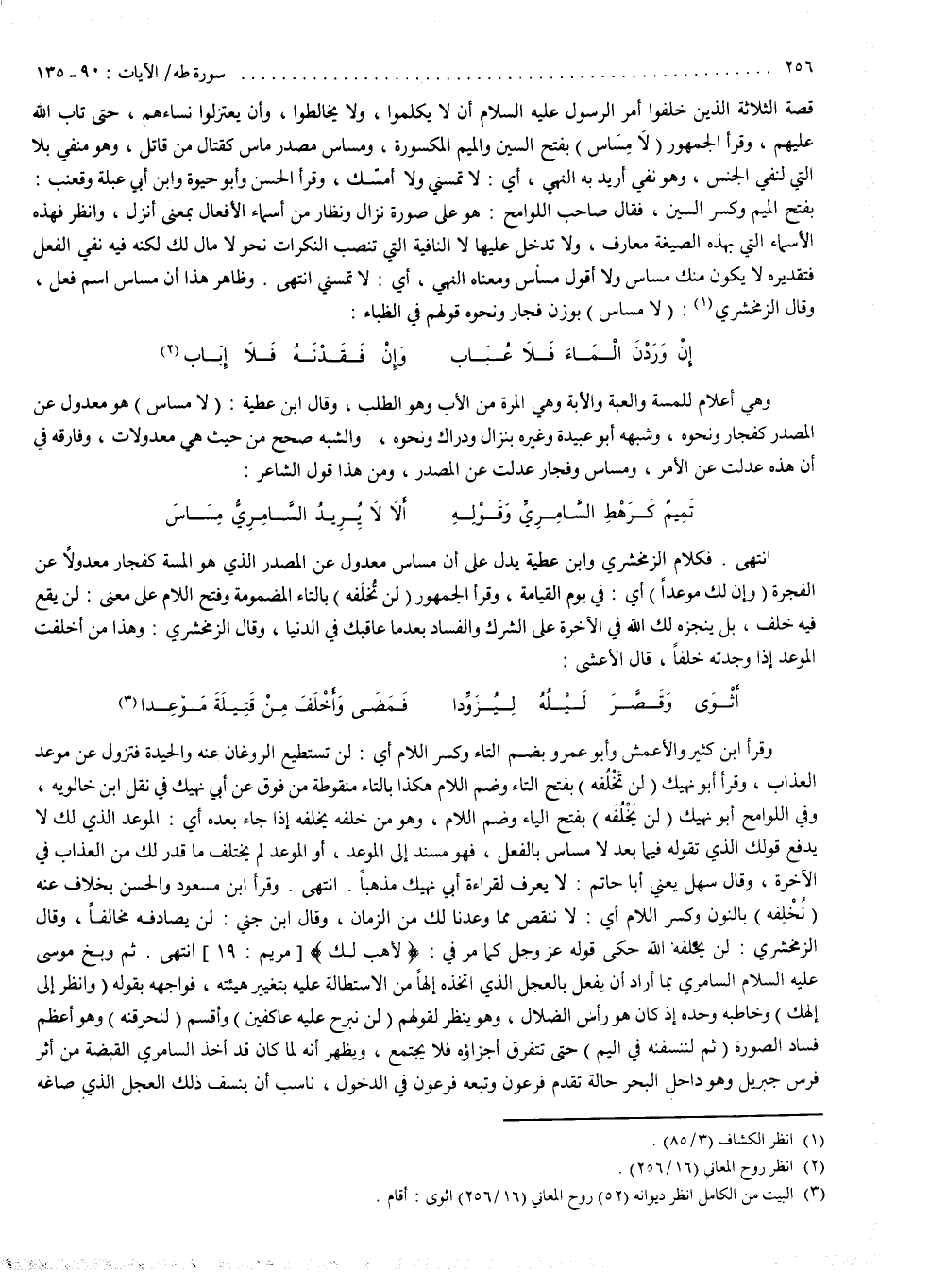 انتهى . فكلام الزمخشري وابن عطية يدل على أن مساس معدول عن المصدر الذي هو المسة ، كفجار معدولاً عن الفجرة ) وَإِنَّ لَكَ مَوْعِداً ( أي في يوم القيامة . وقرأ الجمهور ) لَّن تُخْلَفَهُ ( بالتاء المضمومة وفتح اللام على معنى لن يقع فيه خلف بل ينجزه لك الله في الآخرة على الشرك والفساد بعدما عاقبك في الدنيا . وقال الزمخشري : وهذا من أخلفت الموعد إذا وجدته خلفاً . قال الأعشى : أثوى وقصر ليله ليزوّدا