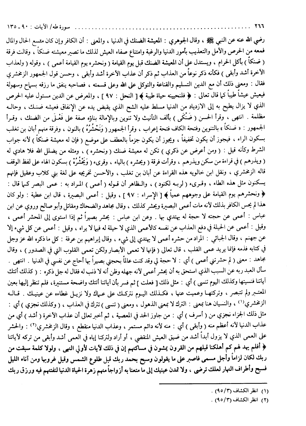 ويستدل على أن المعيشة الضنك قبل يوم القيامة ) وَنَحْشُرُهُ يَوْمَ الْقِيامَةِ أَعْمَى ( وقوله : ) وَلَعَذَابُ الاْخِرَةِ أَشَدُّ وَأَبْقَى ( فكأنه ذكر نوعاً من العذاب ، ثم ذكر أن عذاب الآخرة أشد وأبقى ، وحسن قول الجمهور الزمخشري فقال : ومعنى ذلك أن مع الدين التسليم والقناعة والتوكل على الله وعلى قسمته ، فصاحبه ينفق ما رزقه بسماح وسهولة فيعيش عيشاً طيباً كما قال تعالى ) فَلَنُحْيِيَنَّهُ حَيَواةً طَيّبَةً ( والمعرض عن الدين مستول عليه الحرص الذي لا يزال يطيح به إلى الازدياد من الدنيا مسلط عليه الشح الذي يقبض يده عن الإنفاق ، فعيشه ضنك وحاله مظلمة انتهى .