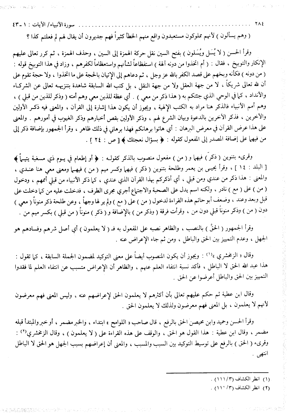 وقال الزمخشري : ويجوز أن يكون المنصوب أيضاً على معنى التوكيد لمضمون الجملة السابقة كما تقول : هذا عبد الله الحق لا الباطل ، فأكد نسبة انتفاء العلم عنهم ، والظاهر أن الإعراض متسبب عن انتفاء العلم لما فقدوا التمييز بين الحق والباطل أعرضوا عن الحق . وقال ابن عطية ثم حكم عليهم تعالى بأن ) أَكْثَرُهُمْ لاَ يَعْلَمُونَ الْحَقَّ ( لإعراضهم عنه وليس المعنى ) فَهُمْ مُّعْرِضُونَ ( لأنهم لا يعلمون بل المعنى ) فَهُمْ مُّعْرِضُونَ ( ولذلك ) لاَ يَعْلَمُونَ الْحَقَّ ( وقرأ الحسن وحميد وابن محيصن ) الْحَقّ ( بالرفع . قال صاحب اللوامح : ابتداءً والخبر مضمر ، أو خبر والمبتدأ قبله مضمر . وقال ابن عطية : هذا القول هو ) الْحَقّ ( والوقف على هذه القراءة على ) لاَّ يَعْلَمُونَ ).