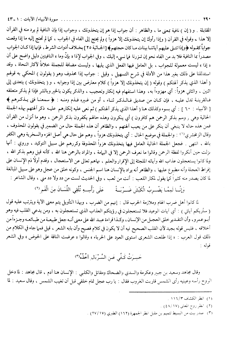 وقيل : جواب ) إِذَا ( محذوف وهو يقولون المحكي به قولهم ) أَهَاذَا الَّذِى يَذْكُرُ الِهَتَكُمْ ( وقوله ) إِن يَتَّخِذُونَكَ إِلاَّ هُزُواً ( كلام معترض بين ) إِذَا ( وجوابه و ) يَتَّخِذُونَكَ ( يتعدى إلى اثنين ، والثاني ) هُزُواً ( أي مهزوأ به ، وهذا استفهام فيه إنكار وتعجيب . والذكر يكون بالخير وبالشر ، فإذا لم يذكر متعلقه فالقرينة تدل عليه ، فإن كان من صديق فالذكر ثناء أو من غيره فذم ، ومنه ) سَمِعْنَا فَتًى يَذْكُرُهُمْ ( أي بسوء ، وكذلك هنا ) أَهَاذَا الَّذِى يَذْكُرُ الِهَتَكُمْ ).