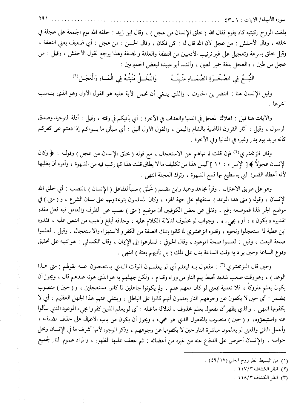 بلغت الروح ركبتيه كاد يقوم فقال الله ) خُلِقَ الإنْسَانُ مِنْ عَجَلٍ ). وقال ابن زيد : خلقه الله يوم الجمعة على عجلة في خلقه . وقال الأخفش ) مِنْ عَجَلٍ ( لأن الله قال له كن فكان . وقال الحسن : ) مِنْ عَجَلٍ ( أي ضعيف يعني النطفة . وقيل : خلق بسرعة وتعجيل على غير تريب الآدميين من النطفة والعلقة والمضغة ، وهذا يرجع لقول الأخفش . وقيل : ) مِنْ عَجَلٍ ( من طين والعجل بلغة حمير الطين . وأنشد أبو عبيدة لبعض الحميريين : النبع في الصخرة الصماء منبته