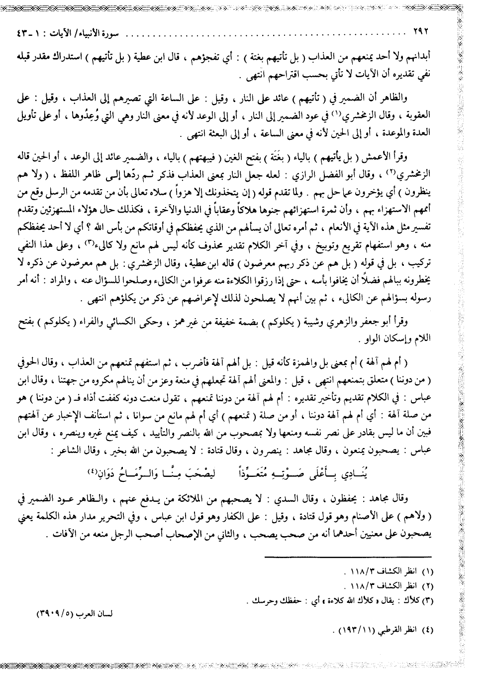 ثم أمره تعالى أن يسألهم من الذي يحفظكم في أوقاتكم من بأس الله أي لا أحد يحفظكم منه ، وهو استفهام تقريع وتوبيخ . وفي آخر الكلام تقدير محذوف كأنه ليس لهم مانع ولا كالىء ، وعلى هذا النفي تركيب بل في قوله ) بَلْ هُمْ عَن ذِكْرِ رَبّهِمْ مُّعْرِضُونَ ( قاله ابن عطية . وقال الزمخشري : بل هم معرضون عن ذكره لا يخطرونه ببالهم فضلاً أن يخافوا بأسه حتى إذا رزقوا الكلاءة منه عرفوا من الكالىء وصلحوا للسؤال عنه ، والمراد أنه أمر رسوله بسؤالهم عن الكالىء ثم بيّن أنهم لا يصلحون لذلك لإعراضهم عن ذكر من يكلؤهم انتهى . وقرأ أبو جعفر والزهري وشيبة : يكلُوكم بضمة خفيفة من غير همز . وحكى الكسائي والفراء يكلَوكم بفتح اللام وإسكان الواو .