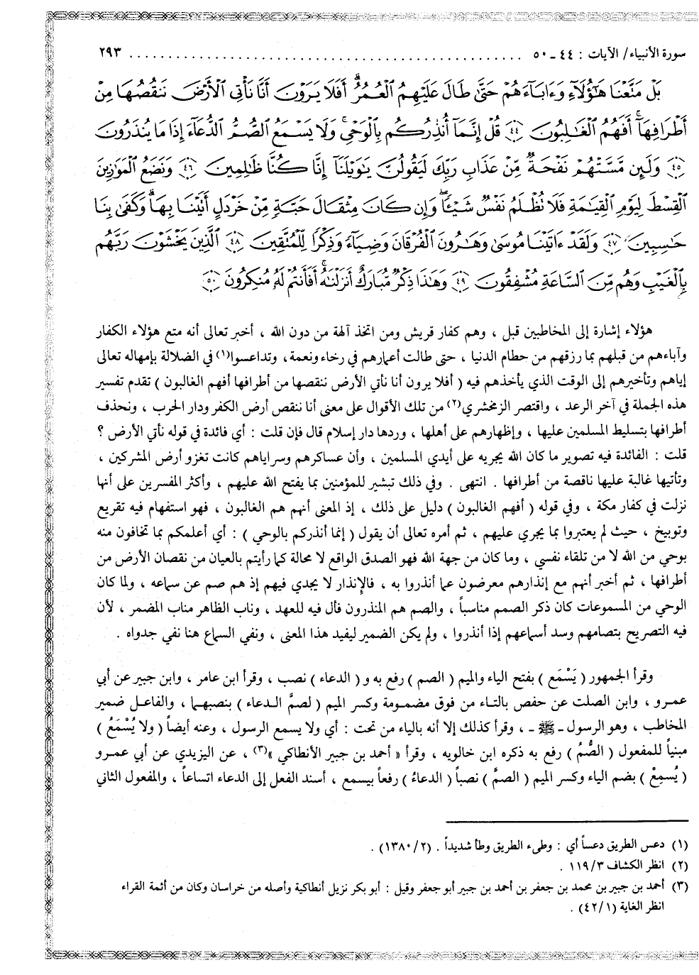 ) بَلْ مَتَّعْنَا هَؤُلاء وَءابَاءهُمْ حَتَّى طَالَ عَلَيْهِمُ الْعُمُرُ أَفَلاَ يَرَوْنَ أَنَّا نَأْتِى الاْرْضَ نَنقُصُهَا مِنْ أَطْرَافِهَا أَفَهُمُ الْغَالِبُونَ قُلْ ( :