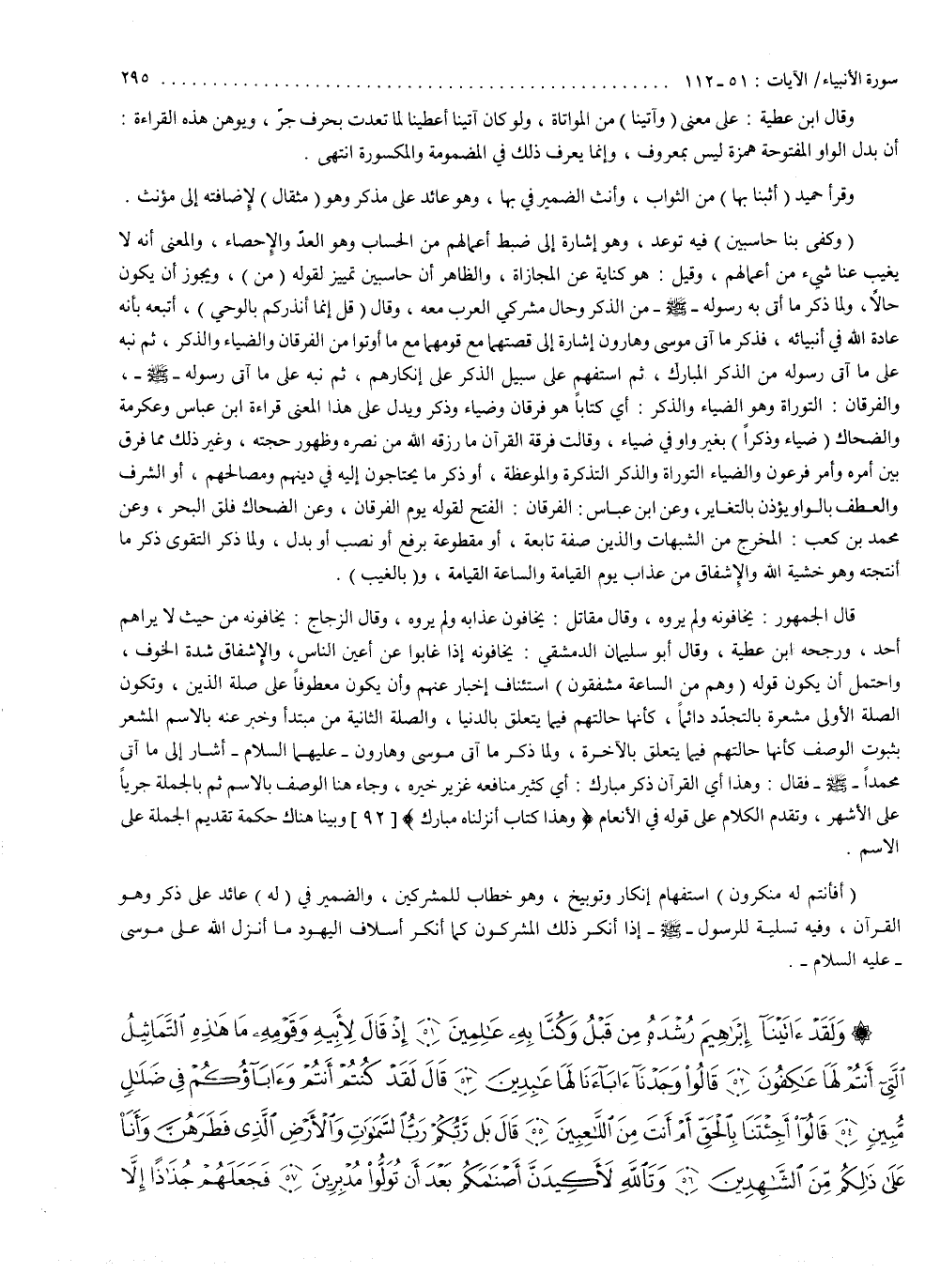 2 ( ) وَلَقَدْ ءَاتَيْنَا مُوسَى وَهَارُونَ الْفُرْقَانَ وَضِيَآءً وَذِكْراً لِّلْمُتَّقِينَ الَّذِينَ يَخْشَوْنَ رَبَّهُمْ بِالْغَيْبِ وَهُمْ مِّنَ السَّاعَةِ مُشْفِقُونَ وَهَاذَا ذِكْرٌ مُّبَارَكٌ أَنزَلْنَاهُ أَفَأَنْتُمْ لَهُ مُنكِرُونَ وَلَقَدْ ءَاتَيْنَآ إِبْرَاهِيمَ رُشْدَهُ مِن قَبْلُ وَكُنَّا بِهِ عَالِمِينَ إِذْ قَالَ لاًّبِيهِ وَقَوْمِهِ مَا هَاذِهِ التَّمَاثِيلُ الَّتِىأَنتُمْ لَهَا عَاكِفُونَ قَالُواْ وَجَدْنَآ ءَابَآءَنَا لَهَا عَابِدِينَ قَالَ لَقَدْ كُنتُمْ أَنتُمْ وَءَابَآؤُكُمْ فِى ضَلَالٍ مُّبِينٍ قَالُواْ أَجِئْتَنَا بِالْحَقِّ أَمْ أَنتَ مِنَ اللَّاعِبِينَ قَالَ بَل رَّبُّكُمْ رَبُّ السَّمَاوَاتِ وَالاٌّ رْضِ الَّذِى فطَرَهُنَّ وَأَنَاْ عَلَى ذالِكُمْ مِّنَ الشَّاهِدِينَ وَتَاللَّهِ لأَكِيدَنَّ أَصْنَامَكُمْ بَعْدَ أَن تُوَلُّواْ مُدْبِرِينَ فَجَعَلَهُمْ جُذَاذاً إِلا