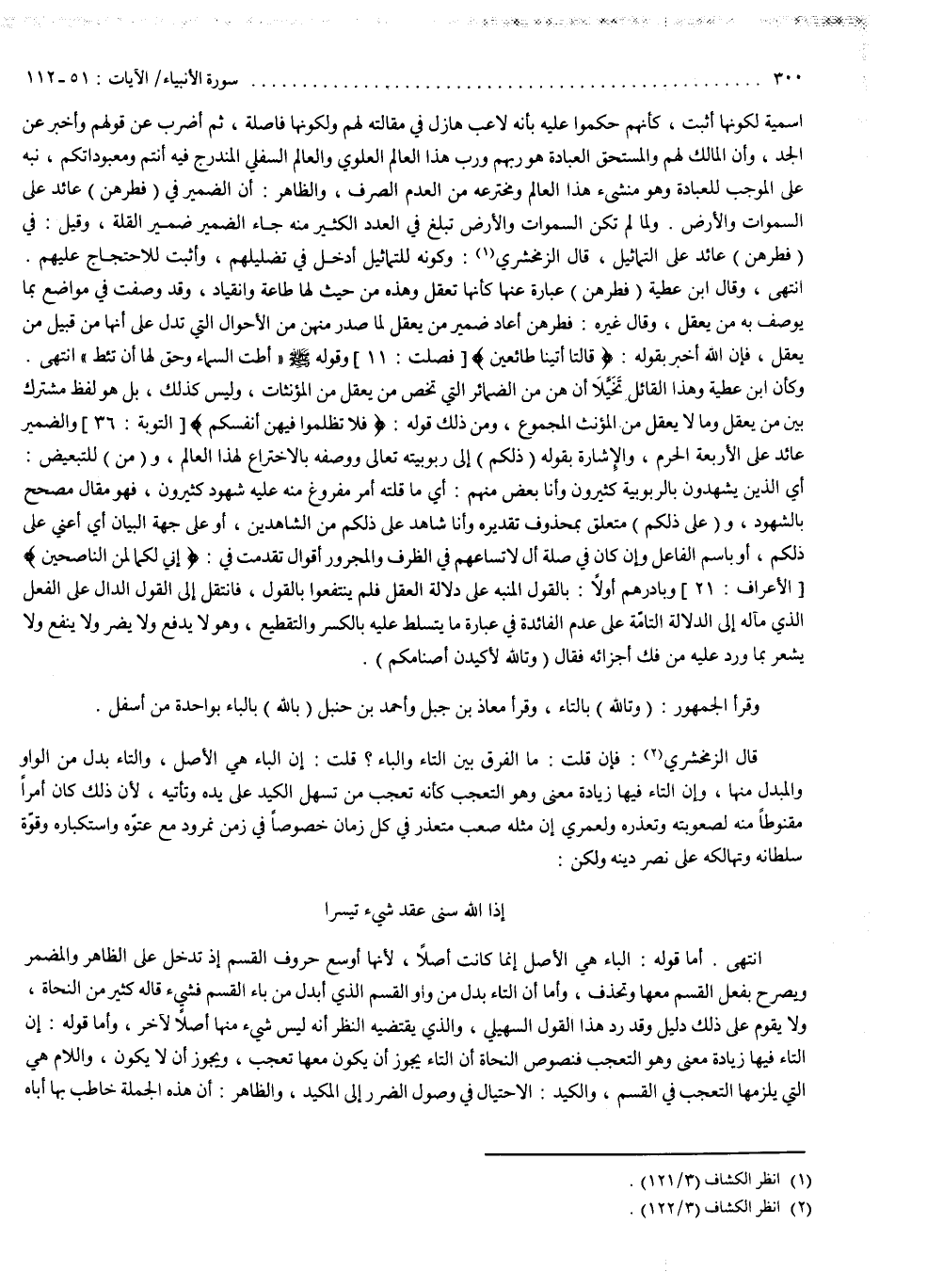 فانتقل إلى القول الدال على الفعل الذي مآله إلى الدلالة التامّة على عدم الفائدة في عبارة ما يتسلط عليه بالكسر والتقطيع وهو لا يدفع ولا يضر ولا ينفع ولا يشعر بما ورد عليه من فك أجزائه فقال : ) وَتَاللَّهِ لاكِيدَنَّ أَصْنَامَكُمْ ( وقرأ الجمهور ) وَتَاللَّهِ ( بالتاء . وقرأ معاذ بن جبل وأحمد بن حنبل بالله بالباء بواحدة من أسفل . قال الزمخشري : فإن قلت : ما الفرق بين التاء والباء ؟ قلت : إن الباء هي الأصل والتاء بدل من الواو المبدل منها ، وإن التاء فيها زيادة معنى وهو التعجب ، كأنه تعجب من تسهل الكيد على يبده وتأتيه لأن ذلك كان أمراً مقنوطاً منه لصعوبته وتعذره ، ولعمري إن مثله صعب متعذر في كل زمان خصوصاً في زمن نمروذ مع عتوّه واستكبار وقوّة سلطانه وتهالكه على نصر دينه ولكن .
