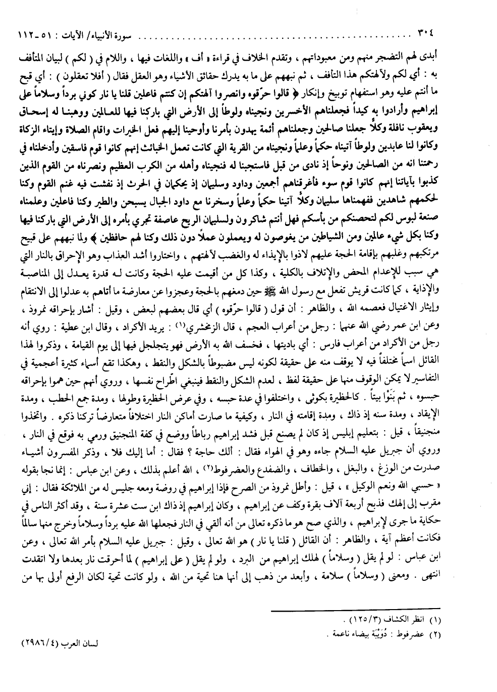 ( قَالُواْ حَرّقُوهُ وَانصُرُواْ ءالِهَتَكُمْ إِن كُنتُمْ فَاعِلِينَ قُلْنَا ياذَا نَّارٍ كُونِى بَرْداً وَسَلَامَا عَلَى إِبْراهِيمَ وَأَرَادُواْ بِهِ كَيْداً فَجَعَلْنَاهُمُ الاْخْسَرِينَ وَنَجَّيْنَاهُ وَلُوطاً إِلَى الاْرْضِ الَّتِى بَارَكْنَا فِيهَا لِلْعَالَمِينَ وَوَهَبْنَا لَهُ إِسْحَاقَ وَيَعْقُوبَ نَافِلَةً وَكُلاًّ جَعَلْنَا صَالِحِينَ وَجَعَلْنَاهُمْ أَئِمَّةً يَهْدُونَ بِأَمْرِنَا وَأَوْحَيْنَا إِلَيْهِمْ فِعْلَ الْخَيْراتِ وَإِقَامَ الصَّلواة وَإِيتَاء الزَّكَواةِ وَكَانُواْ لَنَا عَابِدِينَ وَلُوطاً اتَيْنَاهُ حُكْماً وَعِلْماً وَنَجَّيْنَاهُ مِنَ الْقَرْيَةِ الَّتِى كَانَت تَّعْمَلُ الْخَبَائِثَ إِنَّهُمْ كَانُواْ قَوْمَ سَوْء فَاسِقِينَ وَأَدْخَلْنَاهُ فِى رَحْمَتِنَا إِنَّهُ مِنَ الصَّالِحِينَ وَنُوحاً إِذْ نَادَى مِن قَبْلُ فَاسْتَجَبْنَا لَهُ فَنَجَّيْنَاهُ وَأَهْلَهُ مِنَ الْكَرْبِ الْعَظِيمِ وَنَصَرْنَاهُ مِنَ الْقَوْمِ الَّذِينَ كَذَّبُواْ بِئَايَاتِنَا إِنَّهُمْ كَانُواْ قَوْمَ سَوْء فَأَغْرَقْنَاهُمْ أَجْمَعِينَ وَدَاوُودَ وَسُلَيْمَانَ إِذْ يَحْكُمَانِ فِى الْحَرْثِ إِذْ نَفَشَتْ فِيهِ غَنَمُ الْقَوْمِ وَكُنَّا لِحُكْمِهِمْ شَاهِدِينَ فَفَهَّمْنَاهَا سُلَيْمَانَ وَكُلاًّ ءاتَيْنَا حُكْماً وَعِلْماً وَسَخَّرْنَا مَعَ دَاوُودَ الْجِبَالَ يُسَبّحْنَ وَالطَّيْرَ وَكُنَّا فَاعِلِينَ وَعَلَّمْنَاهُ صَنْعَةَ لَبُوسٍ لَّكُمْ لِتُحْصِنَكُمْ مّن بَأْسِكُمْ فَهَلْ أَنتُمْ شَاكِرُونَ وَلِسُلَيْمَانَ الرّيحَ عَاصِفَةً تَجْرِى بِأَمْرِهِ إِلَى الاْرْضِ الَّتِى بَارَكْنَا فِيهَا وَكُنَّا بِكُلّ شَىْء عَالِمِينَ وَمِنَ الشَّيَاطِينِ مَن يَغُوصُونَ لَهُ وَيَعْمَلُونَ عَمَلاً دُونَ ذالِكَ وَكُنَّا لَهُمْ حَافِظِينَ ).