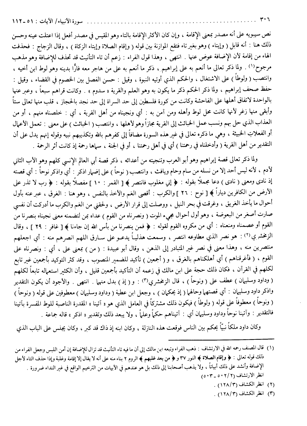 نص سيبويه على أنه مصدر بمعنى الإقامة ، وإن كان الأكثر الإقامة بالتاء وهو المقيس في مصدر أفعل إذا اعتلت عينه وحسن ذلك هنا أنه قابل ) وَإِيتَاء ( وهو بغير تاء فتقع الموازنة بين قوله ) وَجَعَلْنَاهُمْ أَئِمَّةً يَهْدُونَ بِأَمْرِنَا ( وقال الزجاج : فحذفت الهاء من إقامة لأن الإضافة عوض عنها انتهى . وهذا قول الفراء زعم أن تاء التأنيث قد تحذف للإضافة وهو مذهب مرجوح .