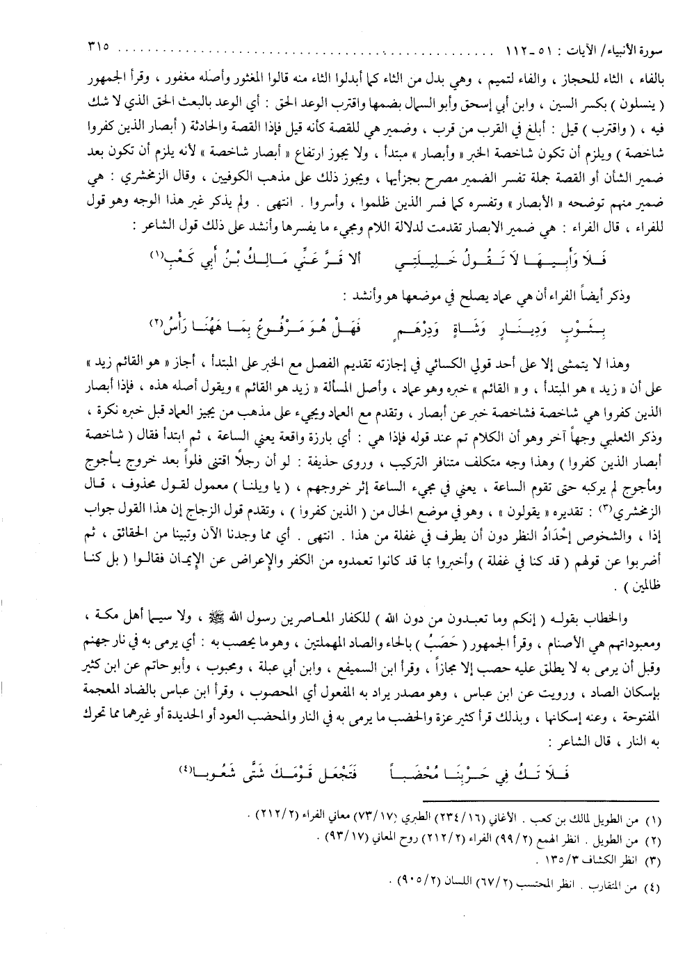 وهذا لا يتمشى إلا على أحد قولي الكسائي في إجازته تقديم الفصل مع الخبر على المبتدأ أجاز هو القائم زيد على أن زيد هو المبتدأ والقائم خبره ، وهو عماد وأصل المسألة زيد هو القائم ، ويقول : أصله هذه فإذا ) أَبْصَارُ الَّذِينَ كَفَرُواْ ( هي ) شَاخِصَةٌ ( فشاخصة خبر عن ) أَبْصَارُ ( وتقدم مع العماد ، ويجيء على مذهب من يجيز العماد قبل خبره نكرة ، وذكر الثعلبي وجهاً آخر وهو أن الكلام ثم عند قوله : ) فَإِذَا هِىَ ( أي بارزة واقعة يعني الساعة ، ثم ابتدأ فقال ) شَاخِصَةٌ أَبْصَارُ الَّذِينَ كَفَرُواْ ( وهذا وجه متكلف متنافر التركيب . وروى حذيفة لو أن رجلاً اقتنى فلو أبعد خروج يأجوج ومأجوج لم يركبه حتى تقوم الساعة يعني في مجيء الساعة إثر خروجهم .