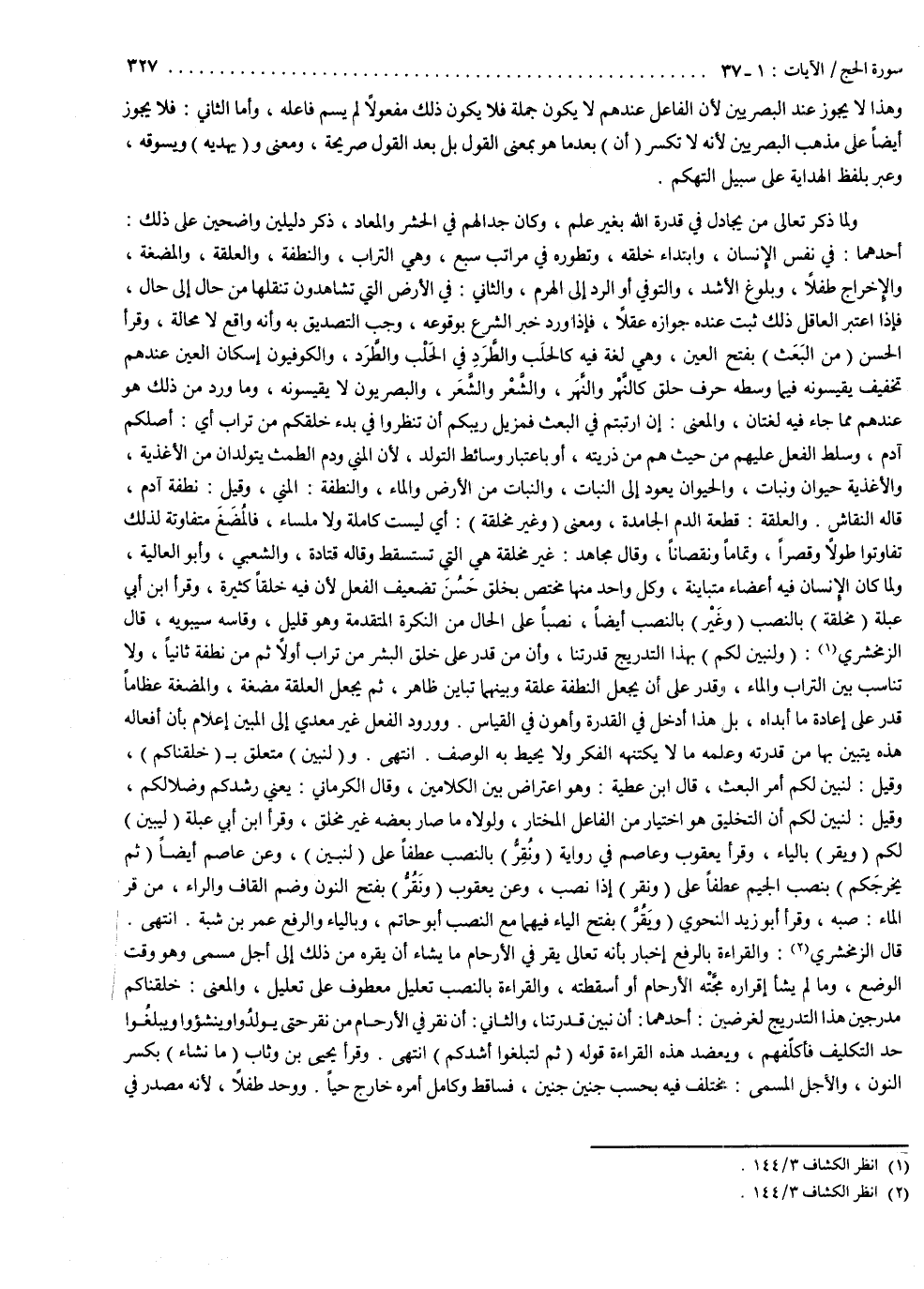 وعن عاصم أيضاً ثم يخرجكم بنصب الجيم عطفاً على ) وَنُقِرُّ ( إذا نصب . وعن يعقوب ) وَنُقِرُّ ( بفتح النون وضم القاف والراء من قر الماء صبه . وقرأ أبو زيد النحوي ويقر بفتح الياء والراء وكسر القاف وفي الكلام لابن حبار ) لّنُبَيّنَ ( ) وَنُقِرُّ ( ) ونخرجكم ( بالنصب فيهن . المفضل وبالياء فيهما مع النصب ، أبو حاتم وبالياء والرفع عمر بن شبة انتهى .