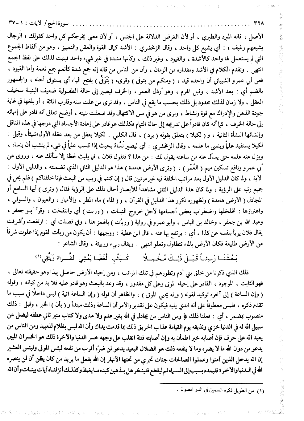 ( ومِنَ النَّاسِ مَن يُجَادِلُ فِى اللَّهِ بِغَيْرِ عِلْمٍ وَلاَ هُدًى وَلاَ كِتَابٍ مُّنِيرٍ ثَانِىَ عِطْفِهِ لِيُضِلَّ عَن سَبِيلِ اللَّهِ لَهُ فِى الدُّنْيَا خِزْىٌ وَنُذِيقُهُ يَوْمَ الْقِيَامَةِ عَذَابَ الْحَرِيقِ ذالِكَ بِمَا قَدَّمَتْ يَدَاكَ وَأَنَّ اللَّهَ لَيْسَ بِظَلَّامٍ لّلعَبِيدِ وَمِنَ النَّاسِ مَن يَعْبُدُ اللَّهَ عَلَى حَرْفٍ فَإِنْ أَصَابَهُ خَيْرٌ اطْمَأَنَّ بِهِ وَإِنْ أَصَابَتْهُ فِتْنَةٌ انْقَلَبَ عَلَى وَجْهِهِ خَسِرَ ). ( سقط : خسر الدنيا والآخرة ذلك هو الخسران المبين ، يدعو من دون الله ما لا يضر ولا ينفع ذلك هو الضلال البعيد ، يدعو لمن ضره أقرب من نفعه لبئس المولى ولبئس العشير ، إن الله يدخل الذين آمنوا وعملوا الصالحات جنات تجري من تحتها الأنهار إن الله يفعل ما يريد ، من كان يظن أن لن ينصره الله في الدنيا والآخرة فليمدد بسبب إلى السماء ثم ليقطع فلينظر هل يذهبن كيده ما يغيظ وكذلك أنزلناه آيات بينات وأن الله )