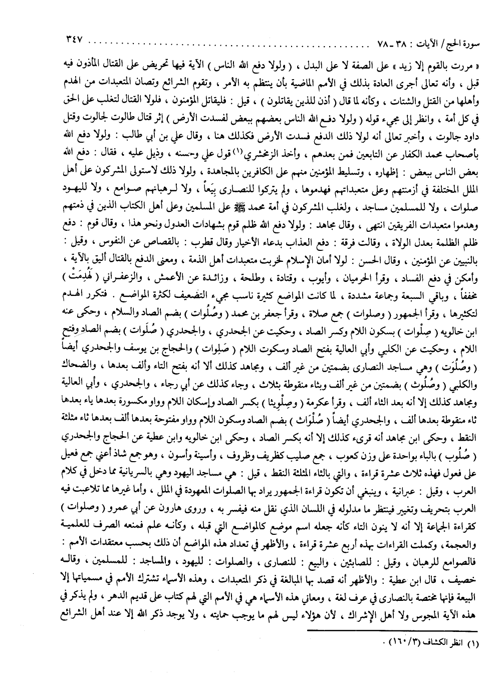 وقال عليّ بن أبي طالب : ولولا دفع الله بأصحاب محمد الكفار عن التابعين فمن بعدهم ، وأخذ الزمخشري قول عليّ وحسنه وذيل عليه فقال : دفع الله بعض الناس ببعض إظهاره وتسليط المؤمنين منهم على الكافرين بالمجاهدة ، ولولا ذلك لاستولى المشركون على أهل الملل المختلفة في أزمنتهم وعلى متعبداتهم فهدموها ولم يتركوا للنصارى بيعاً ولا لرهبانهم صوامع ، ولا لليهود صلوات ، ولا للمسلمين مساجد ، ولغلب المشركون في أمة محمد ( صلى الله عليه وسلم ) ) على المسلمين وعلى أهل الكتاب الذين في ذمتهم ، وهدموا متعبدات الفريقين انتهى .