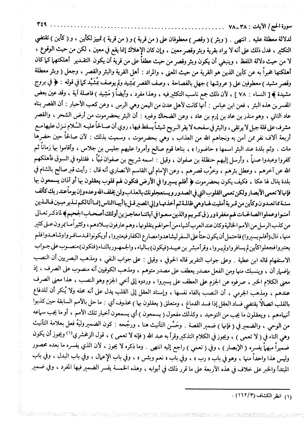 ( وَبِئْرٍ ( ) وَقَصْرٍ ( معطوفان على ) مِن قَرْيَةٍ ( ) وَمِنْ قَرْيَةٌ ( تمييز لكأين ، ( وَكَأَيّن ( تقتضي التكثير ، فدل ذلك على أنه لا يراد بقربه وبئر وقصر معين ، وإن كان الإهلاك إنما يقع في معين لكن من حيث الوقوع لا من حيث دلالة اللفظ ، وينبغي أن يكون ) بئر ( ) مُّعَطَّلَةٍ وَقَصْرٍ ( من حيث عطفاً على ) مِن قَرْيَةٍ ( أن يكون التقدير أهلكتهما كما كان أهلكتها مخبراً به عن ) كأين ( الذي هو القرية من حيث المعنى . والمراد أهل القرية والبئر والقصر ، وجعل ) عُرُوشِهَا وَبِئْرٍ مُّعَطَّلَةٍ وَقَصْرٍ مَّشِيدٍ ( معطوفين على ) عُرُوشِهَا ( جهل بالفصاحة ووصف القصر بمشيد ولم يوصف بمشيد كما في قوله في ) بُرُوجٍ مُّشَيَّدَةٍ ( لأن ذلك جمع ناسب التكثير فيه ، وهذا مفرد وأيضاً ) مَّشِيدٍ ( فاصلة آية .
