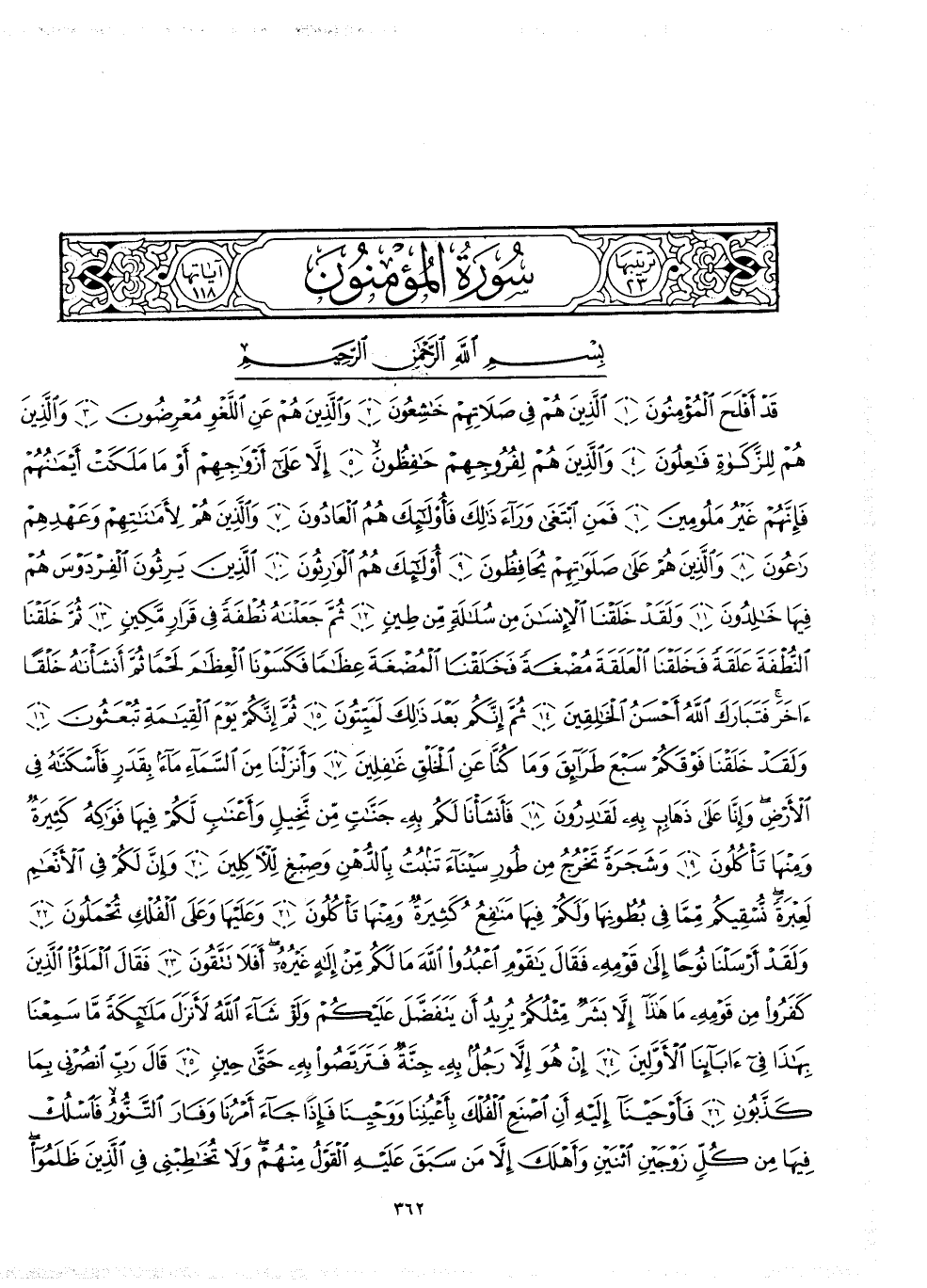 2 ( ) قَدْ أَفْلَحَ الْمُؤْمِنُونَ الَّذِينَ هُمْ فِى صَلاَتِهِمْ خَاشِعُونَ وَالَّذِينَ هُمْ عَنِ اللَّغْوِ مُّعْرِضُونَ وَالَّذِينَ هُمْ لِلزَّكَواةِ فَاعِلُونَ وَالَّذِينَ هُمْ لِفُرُوجِهِمْ حَافِظُونَ إِلاَّ عَلَى أَزْوَاجِهِمْ أَوْ مَا مَلَكَتْ أَيْمَانُهُمْ فَإِنَّهُمْ غَيْرُ مَلُومِينَ فَمَنِ ابْتَغَى وَرَآءَ ذالِكَ فَأُوْلَائِكَ هُمُ الْعَادُونَ وَالَّذِينَ هُمْ لاًّمَانَاتِهِمْ وَعَهْدِهِمْ رَاعُونَ وَالَّذِينَ هُمْ عَلَى صَلَوَاتِهِمْ يُحَافِظُونَ أُوْلَائِكَ هُمُ الْوَارِثُونَ الَّذِينَ يَرِثُونَ الْفِرْدَوْسَ هُمْ فِيهَا خَالِدُونَ وَلَقَدْ خَلَقْنَا الإِنْسَانَ مِن سُلَالَةٍ مِّن طِينٍ ثُمَّ جَعَلْنَاهُ نُطْفَةً فِى قَرَارٍ مَّكِينٍ ثُمَّ خَلَقْنَا النُّطْفَةَ عَلَقَةً فَخَلَقْنَا الْعَلَقَةَ مُضْغَةً فَخَلَقْنَا الْمُضْغَةَ عِظَاماً فَكَسَوْنَا الْعِظَامَ لَحْماً ثُمَّ أَنشَأْنَاهُ خَلْقاً ءَاخَرَ فَتَبَارَكَ اللَّهُ أَحْسَنُ الْخَالِقِينَ ثُمَّ إِنَّكُمْ بَعْدَ ذالِكَ لَمَيِّتُونَ ثُمَّ إِنَّكُمْ يَوْمَ الْقِيَامَةِ تُبْعَثُونَ وَلَقَدْ خَلَقْنَا فَوْقَكُمْ سَبْعَ طَرَآئِقَ وَمَا كُنَّا عَنِ الْخَلْقِ غَافِلِينَ وَأَنزَلْنَا مِنَ السَّمَآءِ مَآءً بِقَدَرٍ فَأَسْكَنَّاهُ فِى الاٌّ رْضِ وَإِنَّا عَلَى ذَهَابٍ بِهِ لَقَادِرُونَ فَأَنشَأْنَا لَكُمْ بِهِ جَنَّاتٍ مِّن نَّخِيلٍ وَأَعْنَابٍ لَّكُمْ فِيهَا فَوَاكِهُ كَثِيرَةٌ وَمِنْهَا تَأْكُلُونَ وَشَجَرَةً تَخْرُجُ مِن طُورِ سَيْنَآءَ تَنبُتُ بِالدُّهْنِ وَصِبْغٍ لِّلأَكِلِيِنَ وَإِنَّ لَكُمْ فِى الاٌّ نْعَامِ لَعِبْرَةً نُّسْقِيكُمْ مِّمَّا فِى بُطُونِهَا وَلَكُمْ فيِهَا مَنَافِعُ كَثِيرَةٌ وَمِنْهَا تَأْكُلُونَ وَعَلَيْهَا وَعَلَى الْفُلْكِ تُحْمَلُونَ وَلَقَدْ أَرْسَلْنَا نُوحاً إِلَى قَوْمِهِ فَقَالَ ياقَوْمِ اعْبُدُواْ اللَّهَ مَا لَكُمْ مِّنْ إِلَاهٍ غَيْرُهُ أَفَلاَ تَتَّقُونَ فَقَالَ الْمَلَؤُا الَّذِينَ كَفَرُواْ مِن قَوْمِهِ مَا هَاذَا إِلاَّ بَشَرٌ مِّثْلُكُمْ يُرِيدُ أَن يَتَفَضَّلَ عَلَيْكُمْ وَلَوْ شَآءَ اللَّهُ لاّنزَلَ مَلَائِكَةً مَّا سَمِعْنَا بِهَاذَا فِىءَابَآئِنَا الاٌّ وَّلِينَ إِنْ هُوَ إِلاَّ رَجُلٌ بِهِ جِنَّةٌ فَتَرَبَّصُواْ بِهِ حَتَّى حِينٍ قَالَ رَبِّ انصُرْنِى بِمَا كَذَّبُونِ فَأَوْحَيْنَآ إِلَيْهِ أَنِ اصْنَعِ الْفُلْكَ بِأَعْيُنِنَا وَوَحْيِنَا فَإِذَا جَآءَ أَمْرُنَا وَفَارَ التَّنُّورُ فَاسْلُكْ فِيهَا مِن كُلِّ زَوْجَيْنِ اثْنَيْنِ وَأَهْلَكَ إِلاَّ مَن سَبَقَ عَلَيْهِ الْقَوْلُ مِنْهُمْ وَلاَ تُخَاطِبْنِى فِى الَّذِينَ ظَلَمُو
