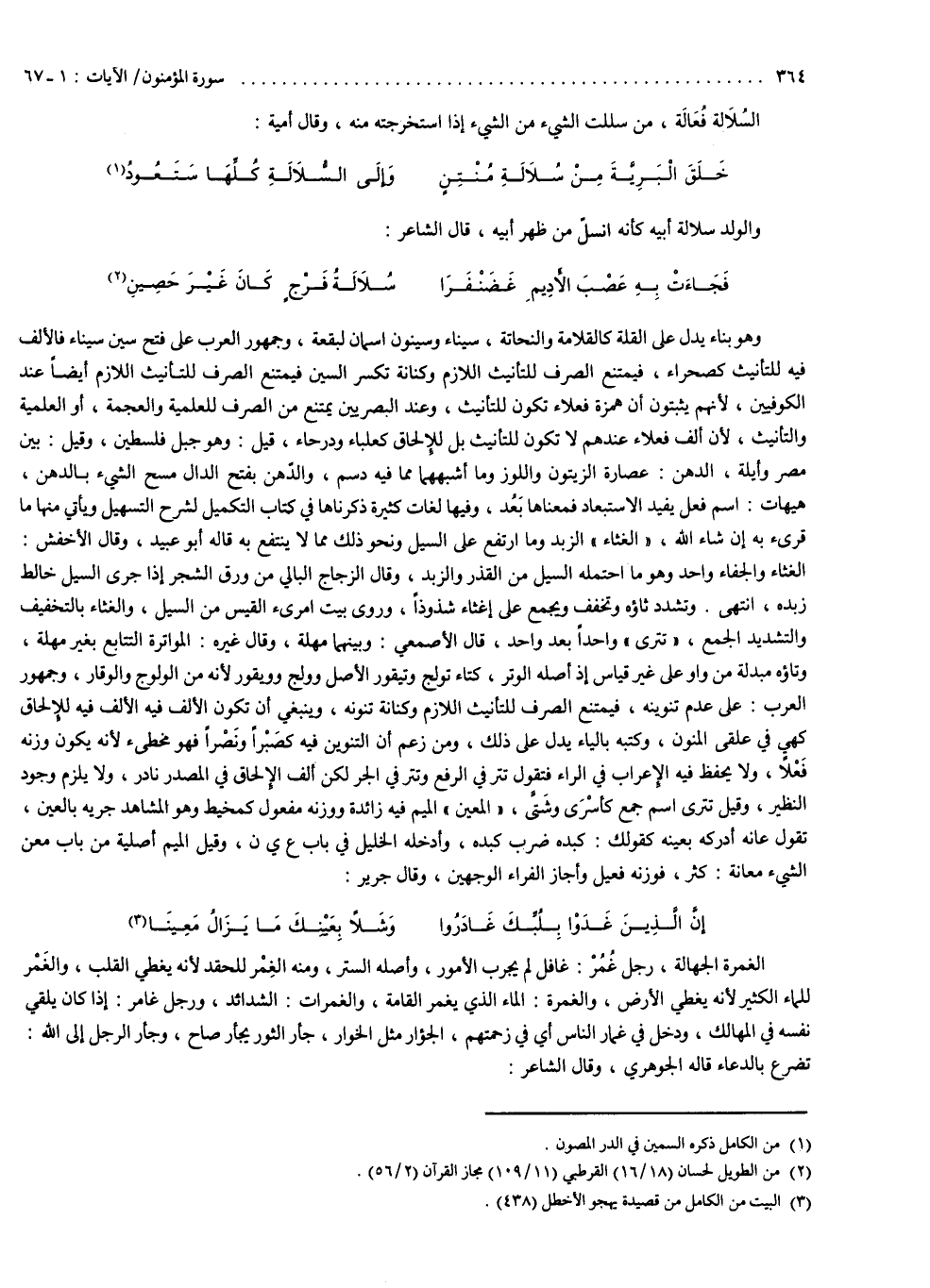 وهو بناء يدل على القلة كالقلامة والنحاتة . سيناء وسينون : اسمان لبقعة ، وجمهور العرب على فتح سين سيناء فالألف فيه للتأنيث كصحراء فيمتنع الصرف للتأنيث اللازم ، وكنانة تكسر السين فيمتنع الصرف للتأنيث اللازم أيضاً عند الكوفيين لأنهم يثبتون أن همزة فعلاء تكون للتأنيث ، وعند البصريين يمتنع من الصرف للعلمية والعجمة أو العلمية والتأنيث ، لأن ألف فعلاء عندهم لا تكون للتأنيث بل للإلحاق كعلباء ودرحاء . قيل : وهو جبل فلسطين . وقيل : بين مصر وأيلة . الدهن : عصارة الزيتون واللوز وما أشبههما مما فيه دسم ، والدهن : بفتح الدال مسح الشيء بالدهن . هيهات : اسم فعل يفيد الاستبعاد فمعناها بعد ، وفيها لغات كثيرة ذكرناها في كتاب التكميل لشرح التسهيل ، ويأتي منها ما قرىء به إن شاء الله . الغثاء : الزبد وما ارتفع على السيل ونحو ذلك مما لا ينتفع به قاله أبو عبيد . وقال الأخفش : الغثاء والجفاء واحد ، وهو ما احتمله السيل من القذر والزبد . وقال الزجاج : البالي من ورق الشجر إذا جرى السيل خالط زبده انتهى . وتشدد ثاؤه وتخفف ، ويجمع غلى أغثاء شذوذاً ، وروى بيت امرىء القيس : من السيل والغثاء بالتخفيف والتشديد بالجمع . تترى واحداً بعد واحد . قال الأصمعي : وبينهما مهلة . وقال غيره : المواترة التتابع بغير مهلة ، وتاؤه مبدلة من واو على غير قياس ، إذ أصله الوتر كتاء تولج وتيقور الأصل وولج وويقور لأنه من الولوج والوقار ، وجمهور العرب على عدم تنوينه فيمتنع الصرف للتأنيث اللازم وكنانة تنونه ، وينبغي أن تكون الألف فيه للإلحاق كهي في علقي المنون ، وكتبه بالياء يدل على ذلك ، ومن زعم أن التنوين فيه كصبراً ونصراً فهو مخطىء لأنه يكون وزنه فعلاً ولا يحفظ فيه الإعراب في الراء ، فتقول تتر في الرفع وتتر في الجر لكن ألف الإلحاق في المصدر نادر ، ولا يلزم وجود النظير . وقيل : تترى اسم جمع كأسرى وشتى . المعين : الميم فيه زائدة ووزنه مفعول كمخيط ، وهو المشاهد جريه بالعين تقول : عانه أدركه بعينه كقولك : كبده ضرب كبده ، وأدخله الخليل في باب ع ي ن . وقيل : الميم أصلية من باب معن الشيء معانة كثر فوزنه فعيل ، وأجاز الفراء الوجهين . وقال جرير : إن الذين غدوا بلبك غادروا