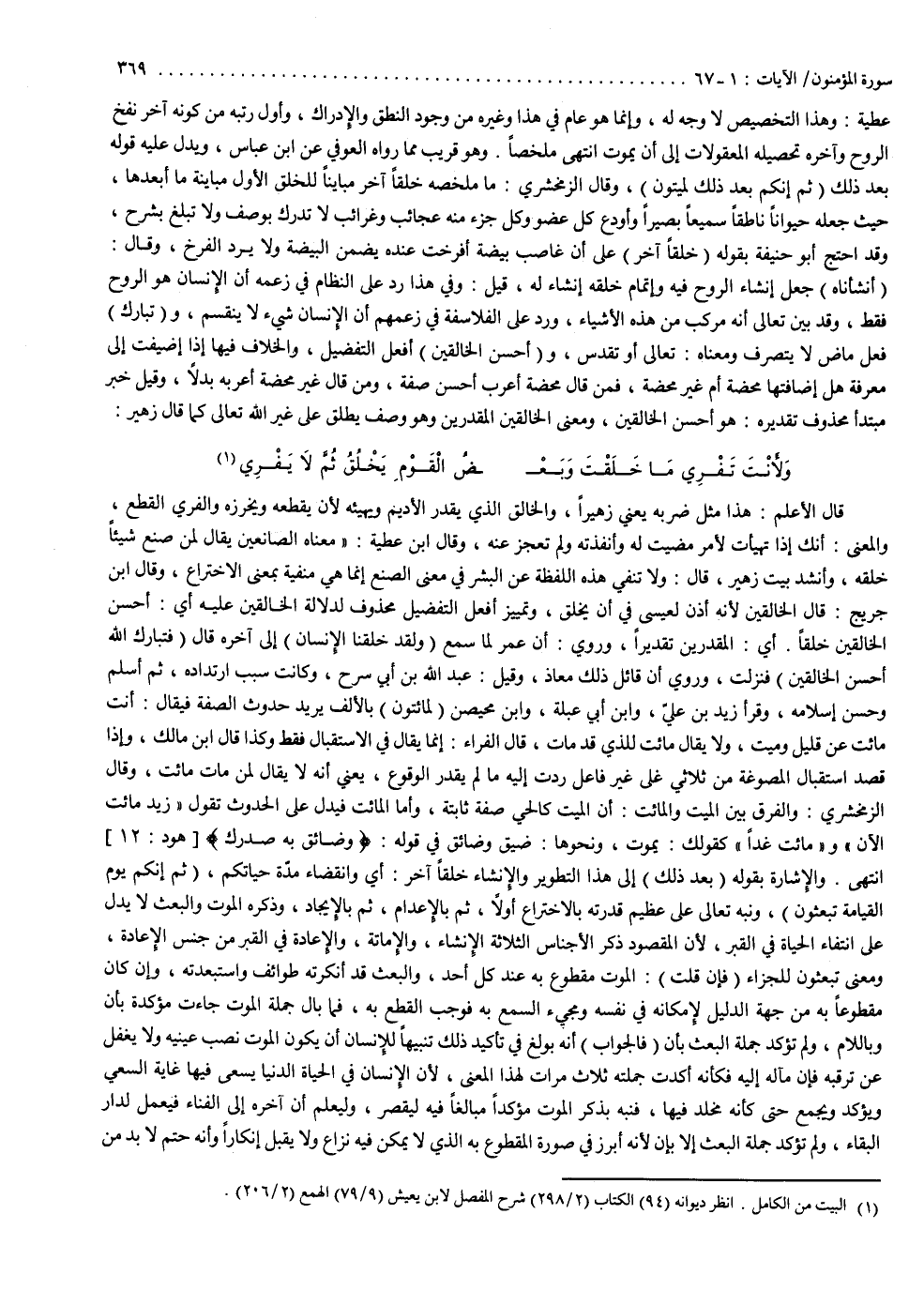 وقال الزمخشري ما ملخصه : ) خَلْقاً ءاخَرَ ( مبايناً للخلق الأول مباينة ما أبعدها حيث جعله حيواناً ناطقاً سميعاً بصيراً ، وأودع كل عضو وكل جزء منه عجائب وغرائب لا تدرك بوصف ولا تبلغ بشرح ، وقد احتج أبو حنيفة بقوله ) خَلْقاً ءاخَرَ ( على أن غاصب بيضة أفرخت عنده يضمن البيضة ولا يرد الفرخ . وقال ) أَنشَأْنَا ( جعل إنشاء الروح فيه وإتمام خلقه إنشاءً له . قيل : وفي هذا رد على النظام في زعمه أن الإنسان هو الروح فقط ، وقد بيّن تعالى أنه مركب من هذه الأشياء ورد على الفلاسفة في زعمهم أن الإنسان شيء لا ينقسم ، وتبارك فعل ماض لا يتصرف . ومعناه تعالى وتقدس و ) أَحْسَنُ الْخَالِقِينَ ( أفعل التفضيل والخلاف فيها إذا أضيفت إلى معرفة هل إضافتها محضة أم غير محضة ؟ فمن قال محضة أعرب ) أَحْسَنُ ( صفة ، ومن قال غير محضة أعربه بدلاً . وقيل : خبر مبتدأ محذوف تقديره هو أحسن الخالقين ، ومعنى ) الْخَالِقِينَ ( المقدرين وهو وصف يطلق على غيرالله تعالى كما قال زهير :