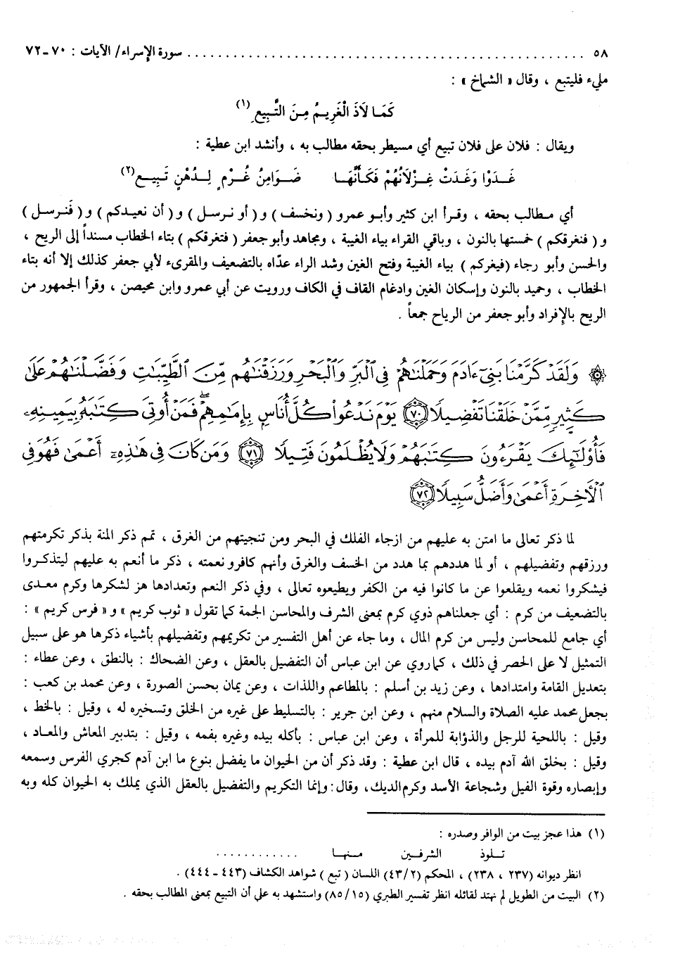 2 ( ) وَلَقَدْ كَرَّمْنَا بَنِىءَادَمَ وَحَمَلْنَاهُمْ فِى الْبَرِّ وَالْبَحْرِ وَرَزَقْنَاهُمْ مِّنَ الطَّيِّبَاتِ وَفَضَّلْنَاهُمْ عَلَى كَثِيرٍ مِّمَّنْ خَلَقْنَا تَفْضِيلاً يَوْمَ نَدْعُواْ كُلَّ أُنَاسٍ بِإِمَامِهِمْ فَمَنْ أُوتِىَ كِتَابَهُ بِيَمِينِهِ فَأُوْلَائِكَ يَقْرَءُونَ كِتَابَهُمْ وَلاَ يُظْلَمُونَ فَتِيلاً وَمَن كَانَ فِى هَاذِهِ أَعْمَى فَهُوَ فِى الاٌّ خِرَةِ أَعْمَى وَأَضَلُّ سَبِيلاً وَإِن كَادُواْ لَيَفْتِنُونَكَ عَنِ الَّذِى أَوْحَيْنَآ إِلَيْكَ لِتفْتَرِىَ عَلَيْنَا غَيْرَهُ وَإِذاً لآَّتَّخَذُوكَ خَلِيلاً وَلَوْلاَ أَن ثَبَّتْنَاكَ لَقَدْ كِدتَّ تَرْكَنُ إِلَيْهِمْ شَيْئًا قَلِيلاً إِذًا لأَذَقْنَاكَ ضِعْفَ الْحَيَواةِ وَضِعْفَ الْمَمَاتِ ثُمَّ لاَ تَجِدُ لَكَ عَلَيْنَا نَصِيرًا وَإِن كَادُواْ لَيَسْتَفِزُّونَكَ مِنَ الاٌّ رْضِ لِيُخْرِجُوكَ مِنْهَا وَإِذًا لاَّ يَلْبَثُونَ خِلَافَكَ إِلاَّ قَلِيلاً سُنَّةَ مَن قَدْ أَرْسَلْنَا قَبْلَكَ مِن رُّسُلِنَا وَلاَ تَجِدُ لِسُنَّتِنَا تَحْوِيلاً أَقِمِ الصَّلَواةَ لِدُلُوكِ الشَّمْسِ إِلَى غَسَقِ الَّيْلِ وَقُرْءَانَ الْفَجْرِ إِنَّ قُرْءَانَ الْفَجْرِ كَانَ مَشْهُودًا وَمِنَ الَّيْلِ فَتَهَجَّدْ بِهِ نَافِلَةً لَّكَ عَسَى أَن يَبْعَثَكَ رَبُّكَ مَقَاماً مَّحْمُودًا وَقُل رَّبِّ أَدْخِلْنِى مُدْخَلَ صِدْقٍ وَأَخْرِجْنِى مُخْرَجَ صِدْقٍ وَاجْعَل لِّى مِن لَّدُنْكَ سُلْطَاناً نَّصِيرًا وَقُلْ جَآءَ الْحَقُّ وَزَهَقَ الْبَاطِلُ إِنَّ الْبَاطِلَ كَانَ زَهُوقًا وَنُنَزِّلُ مِنَ الْقُرْءَانِ مَا هُوَ شِفَآءٌ وَرَحْمَةٌ لِّلْمُؤْمِنِينَ وَلاَ يَزِيدُ الظَّالِمِينَ إَلاَّ خَسَارًا ( ) ) 2
