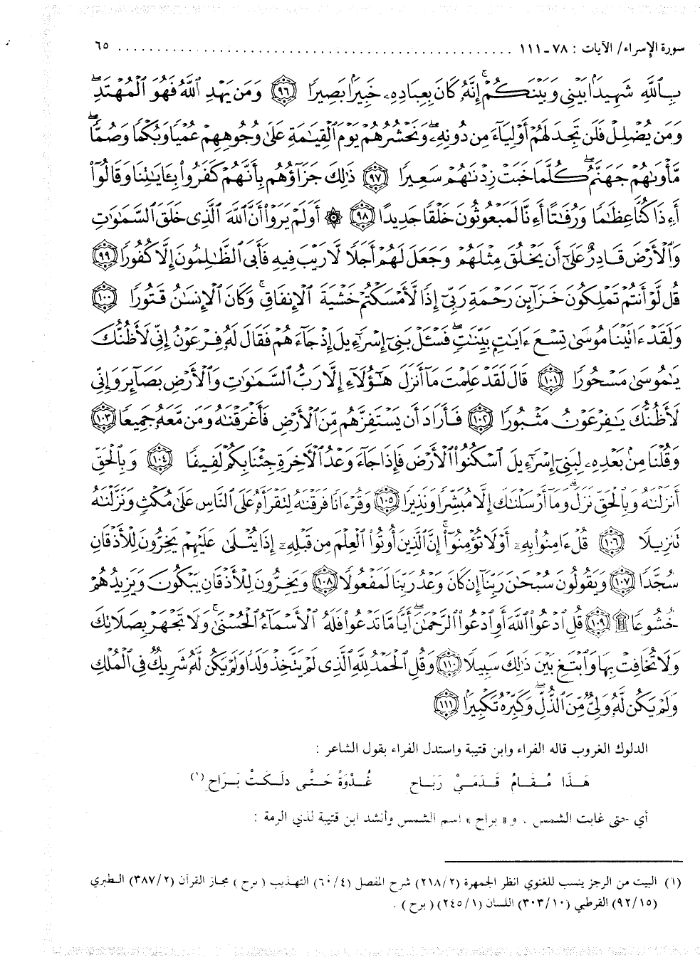 بِاللَّهِ شَهِيدًا بَيْنِى وَبَيْنَكُمْ إِنَّهُ كَانَ بِعِبَادِهِ خَبِيرًا بَصِيرًا وَمَن يَهْدِ اللَّهُ فَهُوَ الْمُهْتَدِ وَمَن يُضْلِلْ فَلَن تَجِدَ لَهُمْ أَوْلِيَآءَ مِن دُونِهِ وَنَحْشُرُهُمْ يَوْمَ الْقِيَامَةِ عَلَى وُجُوهِهِمْ عُمْيًا وَبُكْمًا وَصُمًّا مَّأْوَاهُمْ جَهَنَّمُ كُلَّمَا خَبَتْ زِدْنَاهُمْ سَعِيرًا ذَلِكَ جَزَآؤُهُم بِأَنَّهُمْ كَفَرُواْ بِأايَاتِنَا وَقَالُواْ أَءِذَا كُنَّا عِظَامًا وَرُفَاتًا أَءِنَّا لَمَبْعُوثُونَ خَلْقًا جَدِيدًا أَوَلَمْ يَرَوْاْ أَنَّ اللَّهَ الَّذِى خَلَقَ السَّمَاوَاتِ وَالاٌّ رْضَ قَادِرٌ عَلَى أَن يَخْلُقَ مِثْلَهُمْ وَجَعَلَ لَهُمْ أَجَلاً لاَّ رَيْبَ فِيهِ فَأَبَى الظَّالِمُونَ إَلاَّ كُفُورًا قُل لَّوْ أَنتُمْ تَمْلِكُونَ خَزَآئِنَ رَحْمَةِ رَبِّى إِذًا لأمْسَكْتُمْ خَشْيَةَ الإِنفَاقِ وَكَانَ الإنْسَانُ قَتُورًا وَلَقَدْ ءَاتَيْنَا مُوسَى تِسْعَ ءَايَاتٍ بَيِّنَاتٍ فَاسْأَلْ بَنِى إِسْرَاءِيلَ إِذْ جَآءَهُمْ فَقَالَ لَهُ فِرْعَونُ إِنِّى لأَظُنُّكَ يامُوسَى مَسْحُورًا قَالَ لَقَدْ عَلِمْتَ مَآ أَنزَلَ هَاؤُلاءِ إِلاَّ رَبُّ السَّمَاوَاتِ وَالاٌّ رْضِ بَصَآئِرَ وَإِنِّى لأَظُنُّكَ يافِرْعَونُ مَثْبُورًا فَأَرَادَ أَن يَسْتَفِزَّهُم مِّنَ الاٌّ رْضِ فَأَغْرَقْنَاهُ وَمَن مَّعَهُ جَمِيعًا وَقُلْنَا مِن بَعْدِهِ لِبَنِى إِسْرَاءِيلَ اسْكُنُواْ الاٌّ رْضَ فَإِذَا جَآءَ وَعْدُ الاٌّ خِرَةِ جِئْنَا بِكُمْ لَفِيفًا وَبِالْحَقِّ أَنْزَلْنَاهُ وَبِالْحَقِّ نَزَلَ وَمَآ أَرْسَلْنَاكَ إِلاَّ مُبَشِّرًا وَنَذِيرًا وَقُرْءانًا فَرَقْنَاهُ لِتَقْرَأَهُ عَلَى النَّاسِ عَلَى مُكْثٍ وَنَزَّلْنَاهُ تَنْزِيلاً قُلْ ءَامِنُواْ بِهِ أَوْ لاَ تُؤْمِنُواْ إِنَّ الَّذِينَ أُوتُواْ الْعِلْمَ مِن قَبْلِهِ إِذَا يُتْلَى عَلَيْهِمْ يَخِرُّونَ لِلاٌّ ذْقَانِ سُجَّدًا وَيَقُولُونَ سُبْحَانَ رَبِّنَآ إِن كَانَ وَعْدُ رَبِّنَا لَمَفْعُولاً وَيَخِرُّونَ لِلاٌّ ذْقَانِ يَبْكُونَ وَيَزِيدُهُمْ خُشُوعًا قُلِ ادْعُواْ اللَّهَ أَوِ ادْعُواْ الرَّحْمَنَ أَيًّا مَّا تَدْعُواْ فَلَهُ الاٌّ سْمَآءَ الْحُسْنَى وَلاَ تَجْهَرْ بِصَلاتِكَ وَلاَ تُخَافِتْ بِهَا وَابْتَغِ بَيْنَ ذالِكَ سَبِيلاً وَقُلِ الْحَمْدُ لِلَّهِ الَّذِى لَمْ يَتَّخِذْ وَلَدًا وَلَم يَكُنْ لَّهُ شَرِيكٌ فِى الْمُلْكِ وَلَمْ يَكُنْ لَّهُ وَلِىٌّ مَّنَ الذُّلِّ وَكَبِّرْهُ تَكْبِيرًا } )