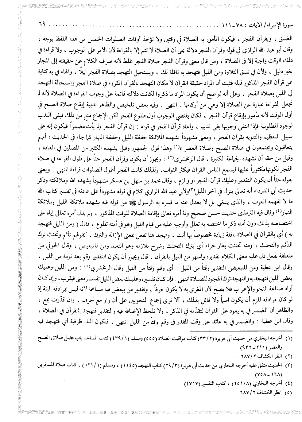 وقال أبو عبد الله الرازي في قوله ) أَقِمِ الصَّلَواةَ ( دلالة على أن الصلاة لا تتم إلاّ بالقراءة لأن الأمر على الوجوب ، ولا قراءة في ذلك الوقت واجبة إلا في الصلاة ومن قال معنى ) أَقِمِ الصَّلَواةَ ( صلاة الفجر غلط لأنه صرف الكلام عن حقيقته إلى المجاز بغير دليل ، ولأن في نسق التلاوة ) وَمِنَ الَّيْلِ فَتَهَجَّدْ بِهِ نَافِلَةً لَّكَ ( ويستحيل التهجد بصلاة الفجر ليلاً . والهاء في ) بِهِ ( كناية عن ) أَقِمِ الصَّلَواةَ ( المذكور قبله ، فثبت أن المراد حقيقة القرآن لا مكان التهجد بالقرآن المقروء في صلاة الفجر واستحالة التهجد في الليل بصلاة الفجر ، وعلى أنه لو صح أن يكون المراد ما ذكروا لكانت دلالته قائمة على وجوب القراءة في الصلاة لأنه لم تجعل القراءة عبارة عن الصلاة إلا وهي من أركانها انتهى . وفيه بعض تلخيص والظاهر ندبية إيقاع صلاة الصبح في أول الوقت لأنه مأمور بإيقاع قرآن الفجر ، فكان يقتضي الوجوب أول طلوع الفجر ، لكن الإجماع منع من ذلك فبقي الندب لوجود المطلوبية ، فإذا انتفى وجوبها بقي ندبها وأعاد ) أَقِمِ الصَّلَواةَ ( في قوله ) أَقِمِ الصَّلَواةَ لِدُلُوكِ ( ولم يأت مضمراً فيكون أنه على سبيل التعظيم والتنويه بقرآن الفجر ومعنى ) مَشْهُودًا ( تشهده الملائكة حفظة الليل وحفظة النهار كما جاء في الحديث : ( إنهم يتعاقبون ويجتمعون في صلاة الصبح وصلاة العصر ) . وهذا قول الجمهور . وقيل يشهده الكثير من المصلين في العادة . وقيل : من حقه أن تشهده الجماعة الكثيرة . قال الزمخشري : ويجوز أن يكون ) أَقِمِ الصَّلَواةَ ( حثاً على طول القراءة في صلاة الفجر لكونها مكثوراً عليها ليسمع الناس القرآن فيكثر الثواب ، ولذلك كانت الفجر أطول الصلوات قراءة انتهى . ويعني بقوله حثاً أن يكون التقدير وعليك ) أَقِمِ الصَّلَواةَ ( أو والزم .