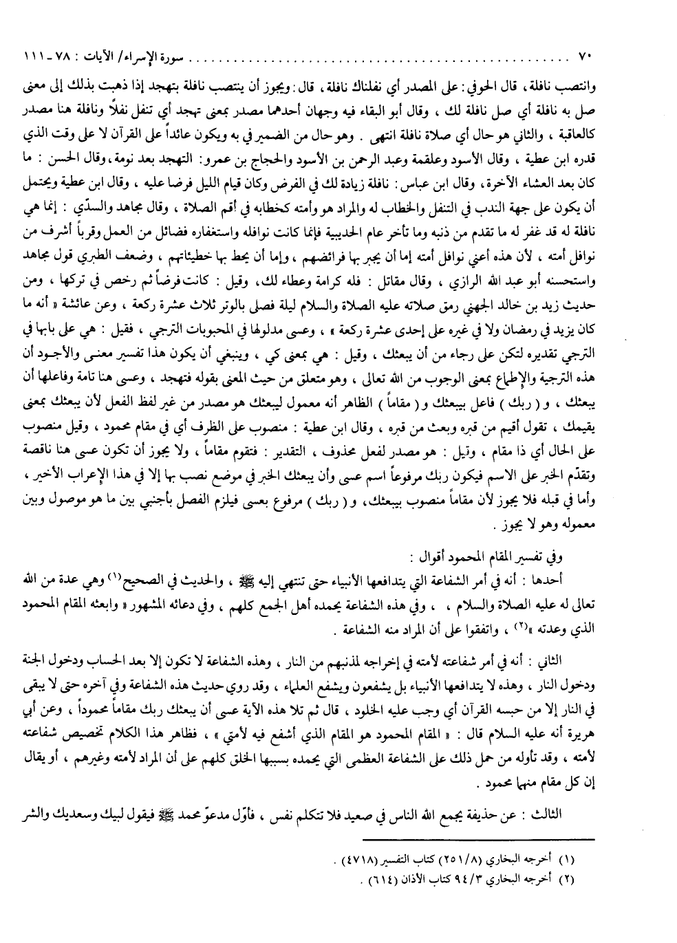 الثاني : أنه في أمر شفاعته لأمته في إخراجه لمذنبهم من النار ، وهذه الشفاعة لا تكون إلاّ بعد الحساب ودخول الجنة ودخول النار ، وهذه لا يتدافعها الأنبياء بل يشفعون ويشفع العلماء . وقد روي حديث هذه الشفاعة وفي آخره : ( حتى لا يبقى في النار إلاّ من حبسه القرآن ) أي وجب عليه الخلود . قال : ثم تلا هذه الآية ) عَسَى أَن يَبْعَثَكَ رَبُّكَ مَقَاماً مَّحْمُودًا ). وعن أبي هريرة أنه عليه السلام قال : ( المقام المحمود هو المقام الذي أشفع فيه لأمتي فظاهر هذا الكلام تخصيص شفاعته لأمته ، وقد تأوله من حمل ذلك على الشفاعة العظمى التي يحمده بسببها الخلق كلهم على أن المراد لأمته وغيرهم أو يقال إن كل مقام منهما محمود .