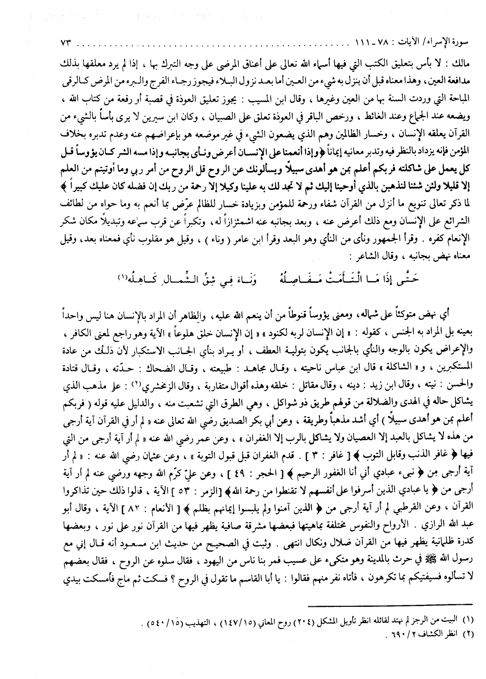 ( وَإِذَا أَنْعَمْنَا عَلَى الإنْسَانِ أَعْرَضَ وَنَأَى بِجَانِبِهِ وَإِذَا مَسَّهُ كَانَ يَئُوساً قُلْ كُلٌّ يَعْمَلُ عَلَى شَاكِلَتِهِ فَرَبُّكُمْ أَعْلَمُ بِمَنْ هُوَ أَهْدَى سَبِيلاً وَيَسْئَلُونَكَ عَنِ الرُّوحِ قُلِ الرُّوحُ مِنْ أَمْرِ رَبّى وَمَا أُوتِيتُم مّن الْعِلْمِ إِلاَّ قَلِيلاً وَلَئِن شِئْنَا لَنَذْهَبَنَّ بِالَّذِى أَوْحَيْنَا إِلَيْكَ ثُمَّ لاَ تَجِدُ لَكَ بِهِ عَلَيْنَا وَكِيلاً إِلاَّ رَحْمَةً مّن رَّبّكَ إِنَّ فَضْلَهُ كَانَ عَلَيْكَ كَبِيرًا ).
