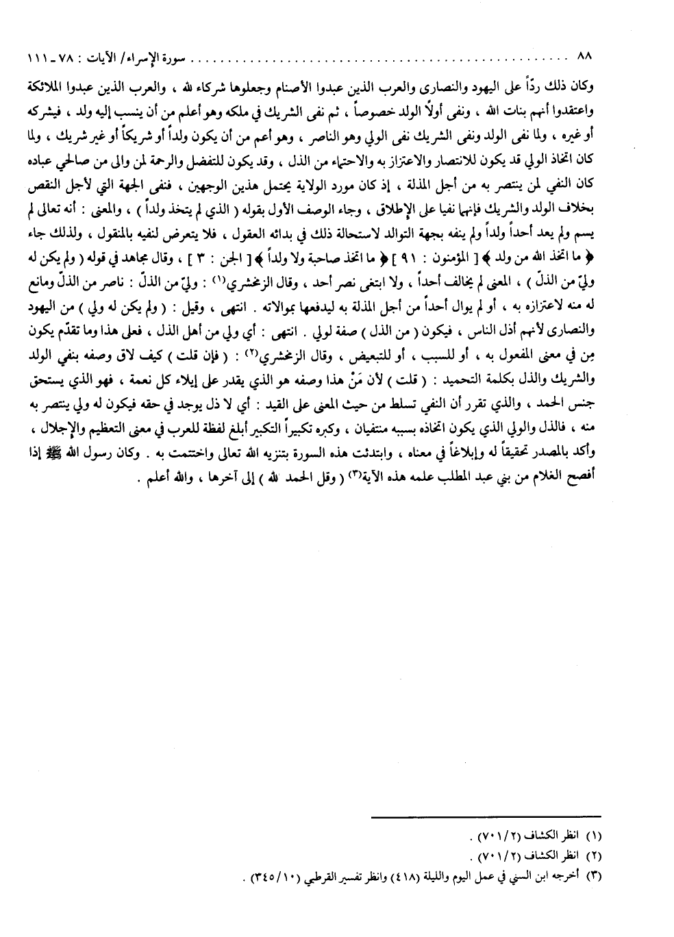 وكان ذلك ردّاً على اليهود والنصاري والعرب الذين عبدوا الأصنام وجعلوها شركاء لله ، والعرب الذين عبدوا الملائكة واعتقدوا أنهم بنات الله . ونفي أولاً الولد خصوصاً ثم نفي الشريك في ملكه وهو أعم من أن ينسب إليه ولد فيشركه أو غيره ، ولما نفي الولد ونفي الشريك نفي الولي وهو الناصر ، وهو أعم من أن يكون ولداً أو شريكاً أو غير شريك . ولما كان اتخاذ الولي قد يكون للانتصار والاعتزاز به والاحتماء من الذلَّ وقد يكون للتفضل والرحمة لمن وإلى من صالحي عباده كان النفي لمن ينتصر به من أجل المذلة ، إذ كان مورد الولاية يحتمل هذين الوجهين فنفي الجهة التي لأجل النقص بخلاف الولد والشريك فإنهما نفياً على الإطلاق . وجاء الوصف الأول بقوله ) الَّذِى لَمْ يَتَّخِذْ وَلَدًا ( والمعنى أنه تعالى لم يسم ولم يعد أحداً ولداً ولم ينفه بجهة التوالد لاستحالة ذلك في بدائه العقول ، فلا يتعرض لنفيه بالمنقول ولذلك جاء ما اتخذ الله من ولد ما يتخذ صاحبة ولا ولداً .