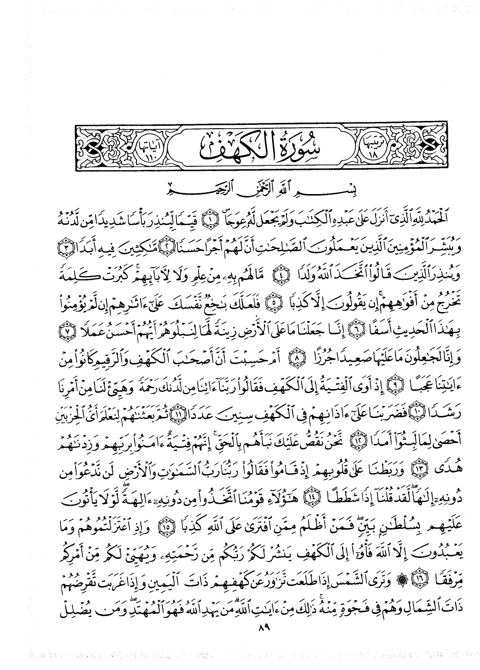 2 ( ) الْحَمْدُ لِلَّهِ الَّذِى أَنْزَلَ عَلَى عَبْدِهِ الْكِتَابَ وَلَمْ يَجْعَل لَّهُ عِوَجَا قَيِّماً لِّيُنْذِرَ بَأْسًا شَدِيدًا مِّن لَّدُنْهُ وَيُبَشِّرَ الْمُؤْمِنِينَ الَّذِينَ يَعْمَلُونَ الصَّالِحَاتِ أَنَّ لَهُمْ أَجْرًا حَسَنًا مَّاكِثِينَ فِيهِ أَبَدًا وَيُنْذِرَ الَّذِينَ قَالُواْ اتَّخَذَ اللَّهُ وَلَدًا مَّا لَهُمْ بِهِ مِنْ عِلْمٍ وَلاَ لأبَآئِهِمْ كَبُرَتْ كَلِمَةً تَخْرُجُ مِنْ أَفْوَاهِهِمْ إِن يَقُولُونَ إِلاَّ كَذِبًا فَلَعَلَّكَ بَاخِعٌ نَّفْسَكَ عَلَىءَاثَارِهِمْ إِن لَّمْ يُؤْمِنُواْ بِهَاذَا الْحَدِيثِ أَسَفاً إِنَّا جَعَلْنَا مَا عَلَى الاٌّ رْضِ زِينَةً لَّهَا لِنَبْلُوَهُمْ أَيُّهُم أَحْسَنُ عَمَلاً وَإِنَّا لَجَاعِلُونَ مَا عَلَيْهَا صَعِيداً جُرُزاً أَمْ حَسِبْتَ أَنَّ أَصْحَابَ الْكَهْفِ وَالرَّقِيمِ كَانُواْ مِنْ ءَايَاتِنَا عَجَبًا إِذْ أَوَى الْفِتْيَةُ إِلَى الْكَهْفِ فَقَالُواْ رَبَّنَآ ءَاتِنَا مِن لَّدُنكَ رَحْمَةً وَهَيِّىءْ لَنَا مِنْ أَمْرِنَا رَشَدًا فَضَرَبْنَا عَلَىءَاذَانِهِمْ فِى الْكَهْفِ سِنِينَ عَدَدًا ثُمَّ بَعَثْنَاهُمْ لِنَعْلَمَ أَيُّ الحِزْبَيْنِ أَحْصَى لِمَا لَبِثُواْ أَمَدًا نَحْنُ نَقُصُّ عَلَيْكَ نبَأَهُم بِالْحَقِّ إِنَّهُمْ فِتْيَةٌ ءَامَنُواْ بِرَبِّهِمْ وَزِدْنَاهُمْ هُدًى وَرَبَطْنَا عَلَى قُلُوبِهِمْ إِذْ قَامُواْ فَقَالُواْ رَبُّنَا رَبُّ السَّمَاوَاتِ وَالاٌّ رْضِ لَن نَّدْعُوَاْ مِن دُونِهِ إِلاهاً لَّقَدْ قُلْنَا إِذًا شَطَطًا هَاؤُلاءِ قَوْمُنَا اتَّخَذْواْ مِن دُونِهِ ءَالِهَةً لَّوْلاَ يَأْتُونَ عَلَيْهِم بِسُلْطَانٍ بَيِّنٍ فَمَنْ أَظْلَمُ مِمَّنِ افْتَرَى عَلَى اللَّهِ كَذِبًا وَإِذِ اعْتَزَلْتُمُوهُمْ وَمَا يَعْبُدُونَ إَلاَّ اللَّهَ فَأْوُواْ إِلَى الْكَهْفِ يَنْشُرْ لَكُمْ رَبُّكُم مِّن رَّحْمَتِهِ وَيُهَيِّىءْ لَكُمْ مِّنْ أَمْرِكُمْ مِّرْفَقًا وَتَرَى الشَّمْسَ إِذَا طَلَعَت تَّزَاوَرُ عَن كَهْفِهِمْ ذَاتَ الْيَمِينِ وَإِذَا غَرَبَت تَّقْرِضُهُمْ ذَاتَ الشِّمَالِ وَهُمْ فِى فَجْوَةٍ مِّنْهُ ذالِكَ مِنْ ءَايَاتِ اللَّهِ مَن يَهْدِ اللَّهُ فَهُوَ الْمُهْتَدِ وَمَن يُضْلِل