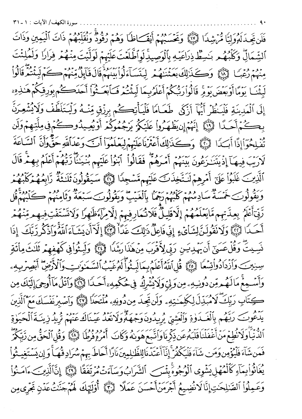 ْ فَلَن تَجِدَ لَهُ وَلِيًّا مُّرْشِدًا وَتَحْسَبُهُمْ أَيْقَاظًا وَهُمْ رُقُودٌ وَنُقَلِّبُهُمْ ذَاتَ اليَمِينِ وَذَاتَ الشِّمَالِ وَكَلْبُهُمْ بَاسِطٌ ذِرَاعَيْهِ بِالوَصِيدِ لَوِ اطَّلَعْتَ عَلَيْهِمْ لَوْلَّيْتَ مِنْهُمْ فِرَارًا وَلَمُلِئْتَ مِنْهُمْ رُعْبًا وَكَذالِكَ بَعَثْنَاهُمْ لِيَتَسَآءَلُوا بَيْنَهُمْ قَالَ قَائِلٌ مِّنْهُمْ كَم لَبِثْتُمْ قَالُواْ لَبِثْنَا يَوْمًا أَوْ بَعْضَ يَوْمٍ قَالُواْ رَبُّكُمْ أَعْلَمُ بِمَا لَبِثْتُمْ فَابْعَثُواْ أَحَدَكُمْ بِوَرِقِكُمْ هَاذِهِ إِلَى الْمَدِينَةِ فَلْيَنْظُرْ أَيُّهَآ أَزْكَى طَعَامًا فَلْيَأْتِكُمْ بِرِزْقٍ مِّنْهُ وَلْيَتَلَطَّفْ وَلاَ يُشْعِرَنَّ بِكُمْ أَحَدًا إِنَّهُمْ إِن يَظْهَرُواْ عَلَيْكُمْ يَرْجُمُوكُمْ أَوْ يُعِيدُوكُمْ فِى مِلَّتِهِمْ وَلَن تُفْلِحُواْ إِذًا أَبَدًا وَكَذالِكَ أَعْثَرْنَا عَلَيْهِمْ لِيَعْلَمُواْ أَنَّ وَعْدَ اللَّهِ حَقٌّ وَأَنَّ السَّاعَةَ لاَ رَيْبَ فِيهَا إِذْ يَتَنَازَعُونَ بَيْنَهُمْ أَمْرَهُمْ فَقَالُواْ ابْنُواْ عَلَيْهِمْ بُنْيَانًا رَّبُّهُمْ أَعْلَمُ بِهِمْ قَالَ الَّذِينَ غَلَبُواْ عَلَى أَمْرِهِمْ لَنَتَّخِذَنَّ عَلَيْهِمْ مَّسْجِدًا سَيَقُولُونَ ثَلَاثَةٌ رَّابِعُهُمْ كَلْبُهُمْ وَيَقُولُونَ خَمْسَةٌ سَادِسُهُمْ كَلْبُهُمْ رَجْماً بِالْغَيْبِ وَيَقُولُونَ سَبْعَةٌ وَثَامِنُهُمْ كَلْبُهُمْ قُل رَّبِّىأَعْلَمُ بِعِدَّتِهِم مَّا يَعْلَمُهُمْ إِلاَّ قَلِيلٌ فَلاَ تُمَارِ فِيهِمْ إِلاَّ مِرَآءً ظَاهِرًا وَلاَ تَسْتَفْتِ فِيهِمْ مِّنْهُمْ أَحَداً وَلاَ تَقْولَنَّ لِشَىْءٍ إِنِّى فَاعِلٌ ذالِكَ غَداً إِلاَّ أَن يَشَآءَ اللَّهُ وَاذْكُر رَّبَّكَ إِذَا نَسِيتَ وَقُلْ عَسَى أَن يَهْدِيَنِ رَبِّى لاًّقْرَبَ مِنْ هَاذَا رَشَدًا وَلَبِثُواْ فِى كَهْفِهِمْ ثَلاثَ مِئَةٍ سِنِينَ وَازْدَادُواْ تِسْعًا قُلِ اللَّهُ أَعْلَمُ بِمَا لَبِثُواْ لَهُ غَيْبُ السَّمَاوَاتِ وَالاٌّ رْضِ أَبْصِرْ بِهِ وَأَسْمِعْ مَا لَهُم مِّن دُونِهِ مِن وَلِىٍّ وَلاَ يُشْرِكُ فِى حُكْمِهِ أَحَدًا وَاتْلُ مَآ أُوْحِىَ إِلَيْكَ مِن كِتَابِ رَبِّكَ لاَ مُبَدِّلَ لِكَلِمَاتِهِ وَلَن تَجِدَ مِن دُونِهِ مُلْتَحَدًا وَاصْبِرْ نَفْسَكَ مَعَ الَّذِينَ يَدْعُونَ رَبَّهُم بِالْغَدَاةِ وَالْعَشِىِّ يُرِيدُونَ وَجْهَهُ وَلاَ تَعْدُ عَيْنَاكَ عَنْهُمْ تُرِيدُ زِينَةَ الْحَيَواةِ الدُّنْيَا وَلاَ تُطِعْ مَنْ أَغْفَلْنَا قَلْبَهُ عَن ذِكْرِنَا وَاتَّبَعَ هَوَاهُ وَكَانَ أَمْرُهُ فُرُطًا وَقُلِ الْحَقُّ مِن رَّبِّكُمْ فَمَن شَآءَ فَلْيُؤْمِن وَمَن شَآءَ فَلْيَكْفُرْ إِنَّا أَعْتَدْنَا لِلظَّالِمِينَ نَارًا أَحَاطَ بِهِمْ سُرَادِقُهَا وَإِن يَسْتَغِيثُواْ يُغَاثُواْ بِمَآءٍ كَالْمُهْلِ يَشْوِى الْوجُوهَ بِئْسَ الشَّرَابُ وَسَآءَتْ مُرْتَفَقًا } )