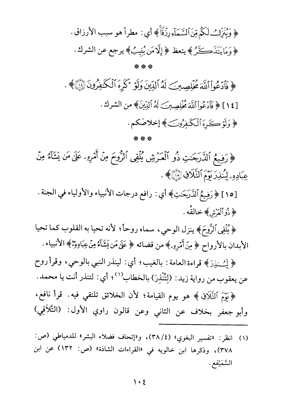 {يَوْمَ التَّلَاقِ} هو يوم القيامة؛ لأن الخلائق تلتقي فيه. قرأ نافع، وأبو جعفر بخلاف عن الثاني وعن قالون راوي الأول: (التَّلاَقِي)