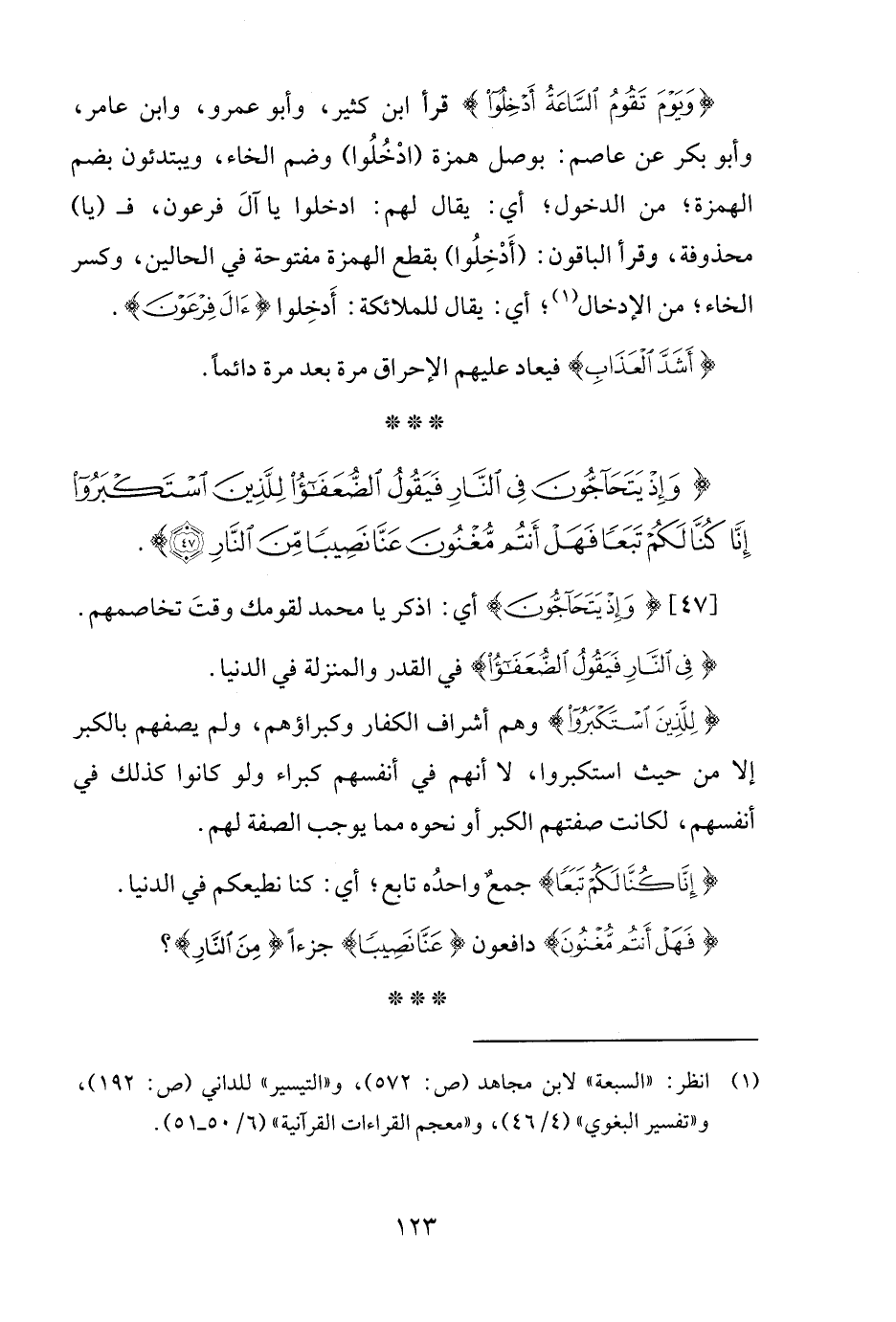 {وَإِذْ يَتَحَاجُّونَ فِي النَّارِ فَيَقُولُ الضُّعَفَاءُ لِلَّذِينَ اسْتَكْبَرُوا إِنَّا كُنَّا لَكُمْ تَبَعًا فَهَلْ أَنْتُمْ مُغْنُونَ عَنَّا نَصِيبًا مِنَ النَّارِ (47)}.