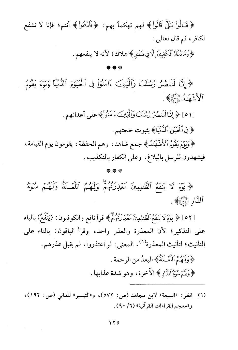 [52] {يَوْمَ لَا يَنْفَعُ الظَّالِمِينَ مَعْذِرَتُهُمْ} قرأ نافع والكوفيون: (يَنْفَعُ) بالياء على التذكير؛ لأن المعذرة والعذر واحد، وقرأ الباقون: بالتاء على التأنيث؛ لتأنيث المعذرة (¬1)، المعنى: لو اعتذروا، لم يقبل عذرهم.