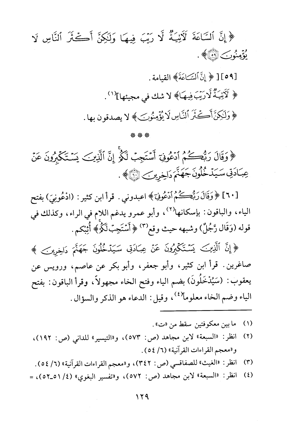 [60] {وَقَالَ رَبُّكُمُ ادْعُونِي} اعبدوني. قرأ ابن كثير: (ادْعُونِيَ) بفتح الياء، والباقون: بإسكانها (¬2)، وأبو عمرو يدغم اللام في الراء، وكذلك في قوله (وَقَال رَّجُلٌ) وشبهه حيث وقع (¬3) {أَسْتَجِبْ لَكُمْ} أُثِبْكم.