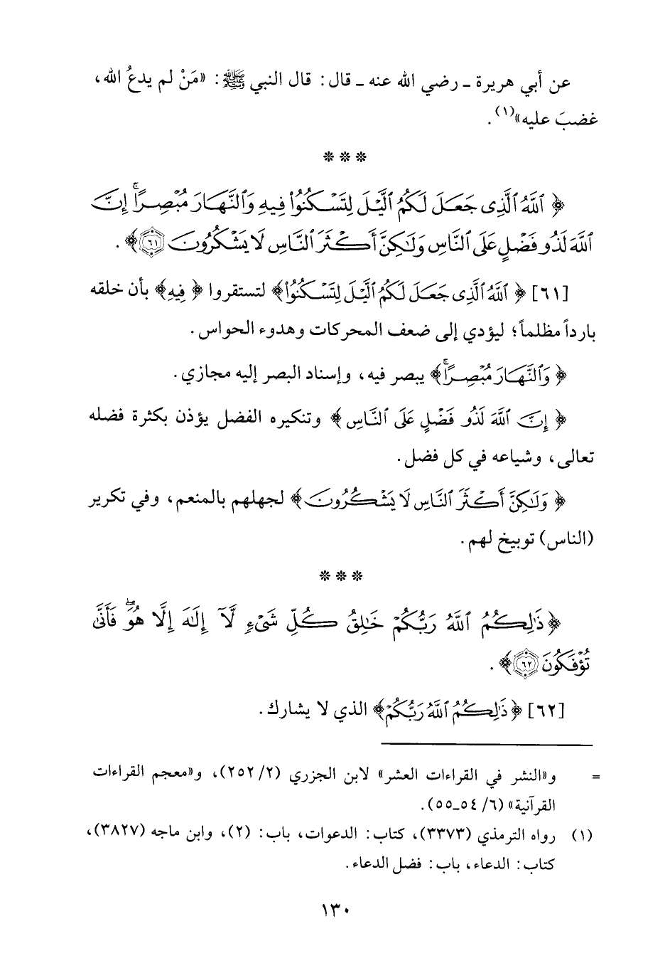{اللَّهُ الَّذِي جَعَلَ لَكُمُ اللَّيْلَ لِتَسْكُنُوا فِيهِ وَالنَّهَارَ مُبْصِرًا إِنَّ اللَّهَ لَذُو فَضْلٍ عَلَى النَّاسِ وَلَكِنَّ أَكْثَرَ النَّاسِ لَا يَشْكُرُونَ (61)}.