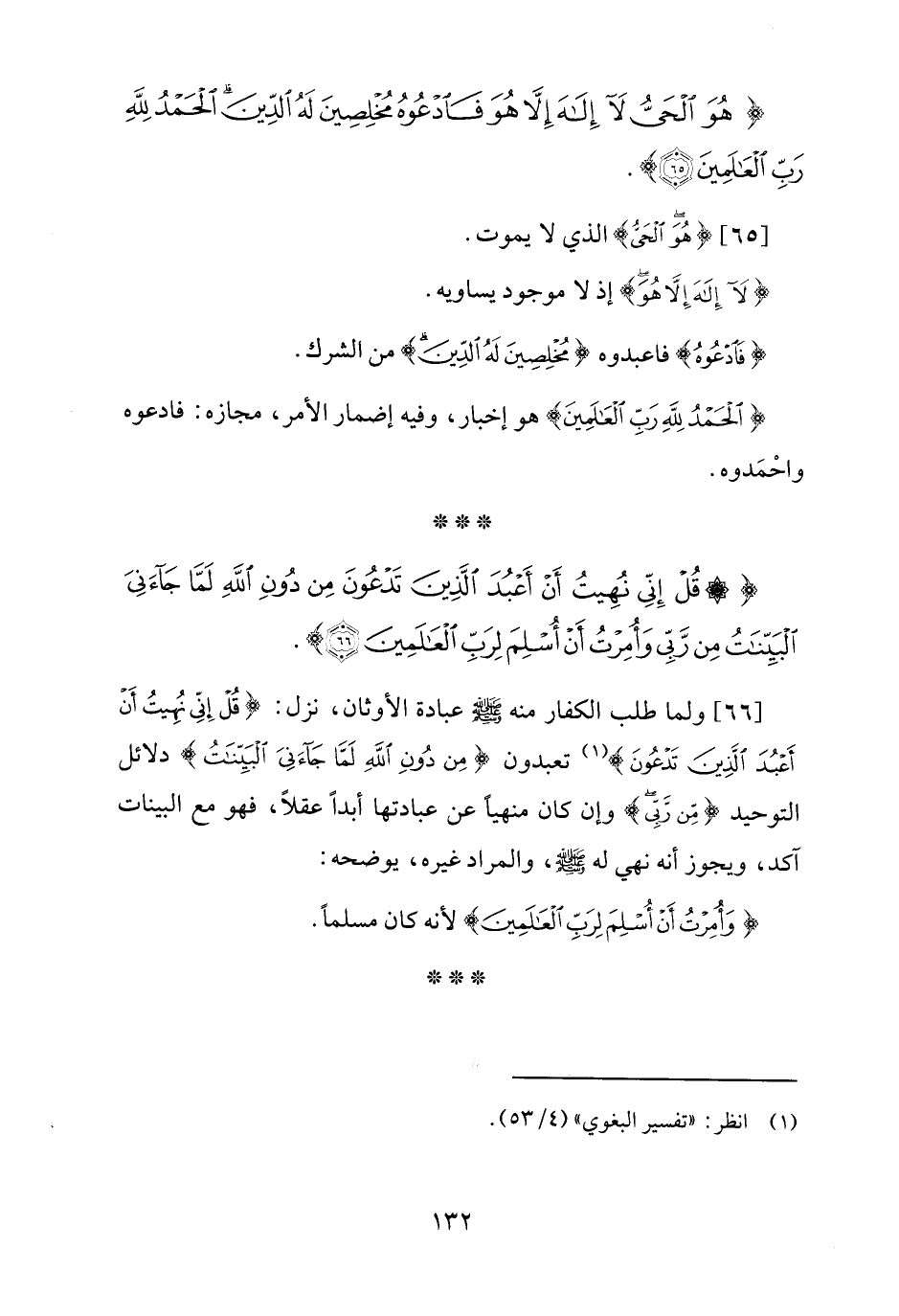 {قُلْ إِنِّي نُهِيتُ أَنْ أَعْبُدَ الَّذِينَ تَدْعُونَ مِنْ دُونِ اللَّهِ لَمَّا جَاءَنِيَ الْبَيِّنَاتُ مِنْ رَبِّي وَأُمِرْتُ أَنْ أُسْلِمَ لِرَبِّ الْعَالَمِينَ (66)}.