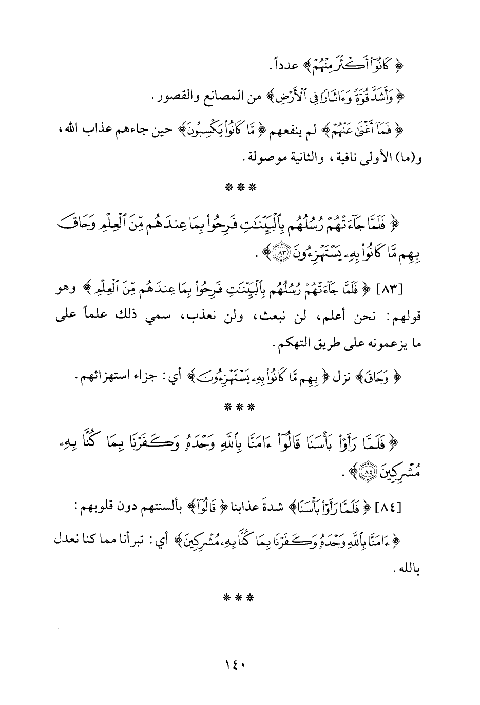 [83] {فَلَمَّا جَاءَتْهُمْ رُسُلُهُمْ بِالْبَيِّنَاتِ فَرِحُوا بِمَا عِنْدَهُمْ مِنَ الْعِلْمِ} وهو قولهم: نحن أعلم، لن نبعث، ولن نعذب، سمي ذلك علمًا على ما يزعمونه على طريق التهكم.