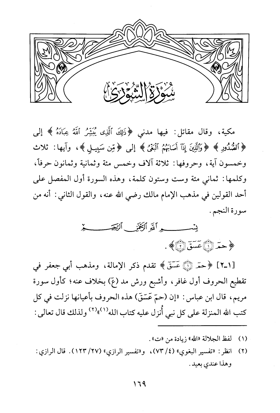 مكية، وقال مقاتل: فيها مدني {ذَلِكَ الَّذِي يُبَشِّرُ اللَّهُ عِبَادَهُ} إلى {الصُّدُورِ} {وَالَّذِينَ إِذَا أَصَابَهُمُ الْبَغْيُ} إلى {مِنْ سَبِيلٍ}، وآيها: ثلاث وخمسون آية، وحروفها: ثلاثة آلاف وخمس مئة وثمانية وثمانون حرفًا، وكلمها: ثماني مئة وست وستون كلمة، وهذه السورة أول المفصل على أحد القولين في مذهب الإمام مالك رضي الله عنه، والقول الثّاني: أنّه من سورة النجم.