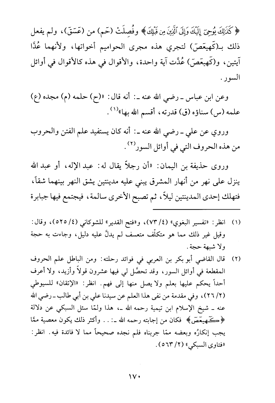 (¬2) قال القاضي أبو بكر بن العربي في فوائد رحلته: ومن الباطل علم الحروف المقطعة في أوائل السور، وقد تحصَّل لي فيها عشرون قولًا وأزيد، ولا أعرف أحدًا يحكم عليها بعلم ولا يصل منها إلى فهم. انظر: "الإتقان " للسيوطي (2/ 26)، وفي مقدمة من نفى هذا العلم عن سيدنا علي بن أبي طالب -رضي الله عنه- شيخ الإسلام ابن تيمية -رحمه الله-، هذا ولمّا سئل السبكي عن دلالة {كهيعص} فكان من إجابته -رحمه الله-: .. وأكثر ذلك يكون معصية ممَّا يجب إنكارُه وبعضه ممّا جربناه فلم نجده صحيحًا ممّا لا فائدة فيه. انظر: "فتاوى السبكي" (2/ 563).
