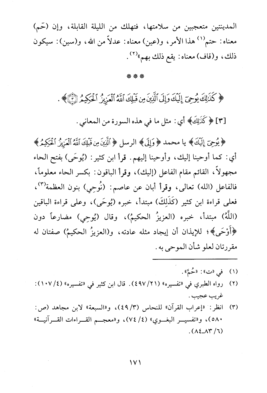 المدينتين متعجبين من سلامتها، فتهلك من اللَّيلة القابلة، وإن (حم) معناه: حتم (¬1) هذا الأمر، و (عين) معناه: عدلًا من الله، و (سين): سيكون ذلك، و (قاف) معناه: يقع ذلك بهم" (¬2).