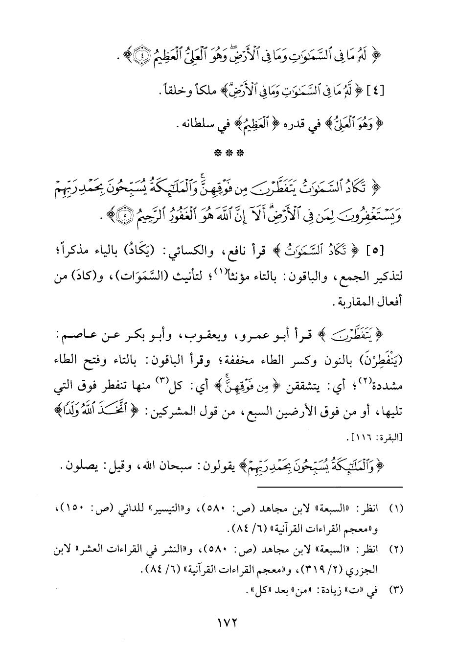 [5] {تَكَادُ السَّمَاوَاتُ} قرأ نافع، والكسائي: (يَكَادُ) بالياء مذكرًا؛ لتذكير الجمع، والباقون: بالتاء مؤنثًا (¬1)؛ لتأنيث (السَّمَوَات)، و (كادَ) من أفعال المقاربة.