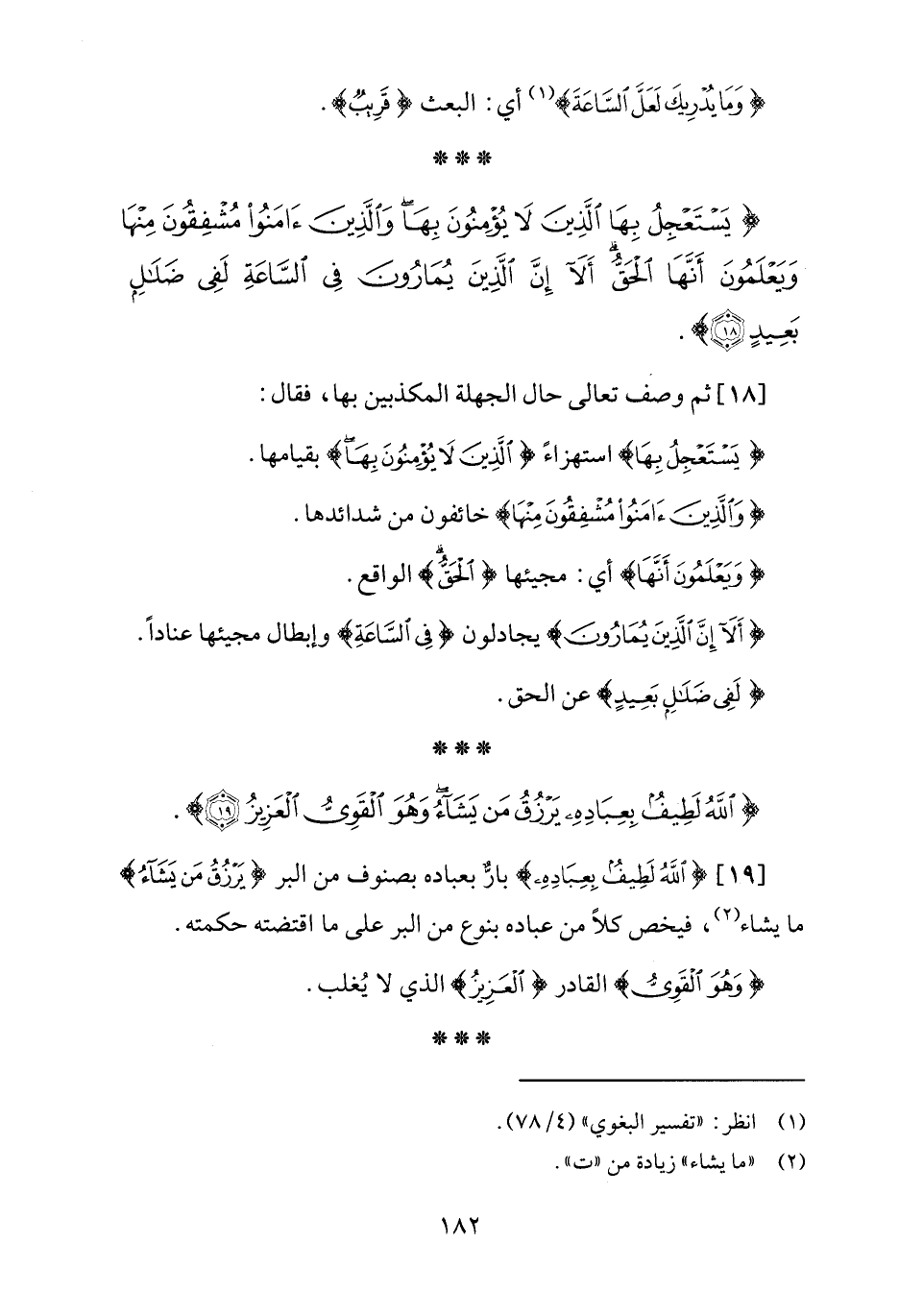 [19] {اللَّهُ لَطِيفٌ بِعِبَادِهِ} بارٌّ بعباده بصنوف من البرّ {يَرْزُقُ مَنْ يَشَاءُ} ما يشاء (¬2)، فيخص كلًّا من عباده بنوع من البرّ على ما اقتضته حكمته.