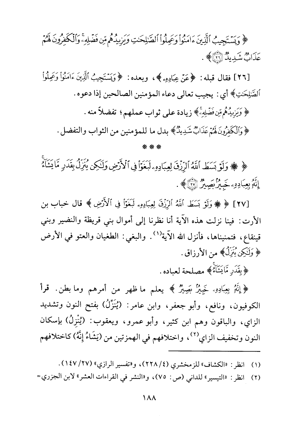 [27] {وَلَوْ بَسَطَ اللَّهُ الرِّزْقَ لِعِبَادِهِ لَبَغَوْا فِي الْأَرْضِ} قال خباب بن الأرت: فينا نزلت هذه الآية أنا نظرنا إلى أموال بني قريظة والنضير وبني قينقاع، فتمنيناها، فأنزل الله الآية (¬1). والبغي: الطغيان والعتو في الأرض {وَلَكِنْ يُنَزِّلُ} من الأرزاق.